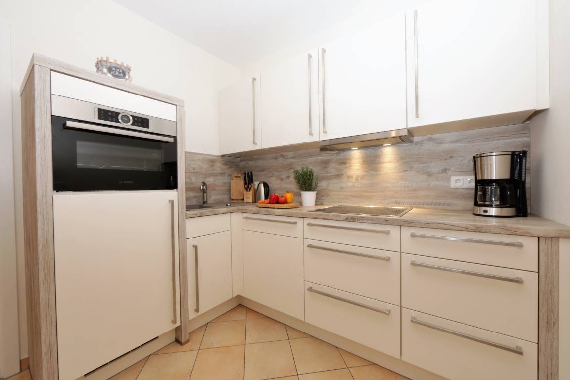Diese modern eingerichtete 3-Zimmer Wohnung ist 67 m² groß und befindet sich im Erdgeschoss des an die Villa angrenzenden Neubaus. Die Wohnung ist komfortabel ausgestattet und bietet 4 Personen Platz für einen erholsamen Inselurlaub. Der großzügige helle Wohnraum bietet Ihnen eine gemütliche Sitzecke mit Sofa, Sessel, TV und Essplatz. Die Küchenzeile inkl. Backofen, Ceranfeld, Kühlschrank, Geschirrspüler etc. ist offen im hinteren Bereich des Wohnraums integriert. Vom Wohnzimmer betreten Sie auch den westlich ausgerichteten Balkon, auf dem Sie den Tag mit einem Glas Wein ausklingen lassen können. Von hier aus können Sie auch einen teilweisen Blick auf das Meer erhaschen. Beide Schlafzimmer sind mit italienischen Stilmöbeln eingerichtet, einem Doppelbett mit getrennten Matratzen (90 x 200) und einem Kleiderschrank. Den großen, überdachten, südlich ausgerichteten Balkon, der zu gemeinsamen Mahlzeiten einlädt, können Sie vom Wohnraum und vom größeren Schlafzimmer betreten. Das moderne Bad ist sowohl mit einer Dusche mit Echtglasabtrennung als auch mit einer Badewanne und Doppelwaschbecken/WC ausgestattet. Außerdem steht den Gästen ein Gäste WC zur Verfügung. Der Pkw- Stellplatz befindet sich auf dem Grundstück und ist der Wohnung zugeordnet.