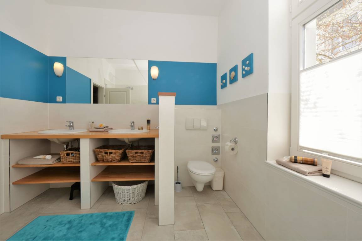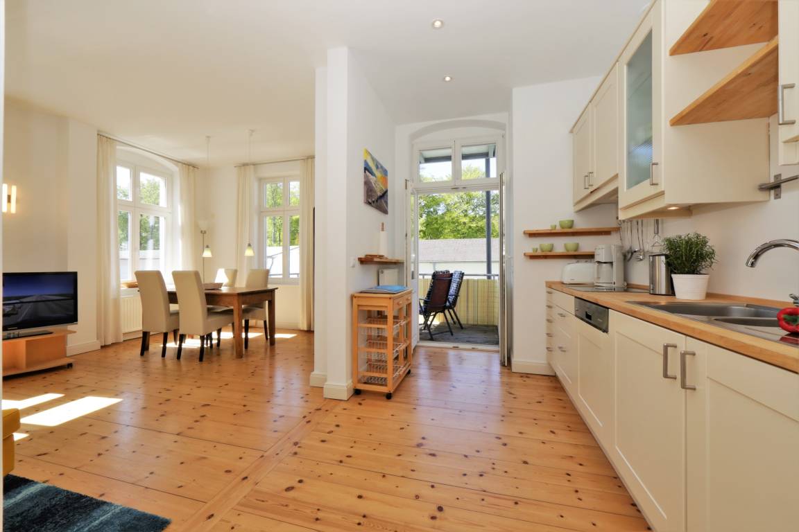 Dieses 94 qm große 3 Zimmer Appartement befindet sich im 1. Obergeschoss. Hier können 2-4 Personen Ihren Urlaub ganz nah am Meer verleben und auch einen Blick auf die Ostsee genießen. Im großzügigen Wohnraum finden Sie eine gemütliche Couchecke mit Flat TV sowie einen großen Essplatz, der viel Platz für gemeinsame Mahlzeiten bietet. Die Vollküche incl. Kühlschrank, Geschirrspüler, Ceranfeld mit Backofen, Mikrowelle etc. grenzt halboffen an den Wohnraum. Von hier aus können Sie auch den südlich ausgerichteten Balkon mit Blick in den Buchenpark betreten, der viele erholsame Sonnenstunden verspricht. Beide Schlafräume sind jeweils mit einem Doppelbett mit getrennten Matratzen (80 bzw. 90 x 200) und einem Kleiderschrank eingerichtet. Den kleineren Seebalkon mit Blick auf das Meer und die Bansiner Seebrücke erreichen Sie von einem der beiden Schlafzimmer. Zwei Badezimmer mit jeweils Dusche sowie Waschtisch/WC komplettieren diese hochwertige Ausstattung.