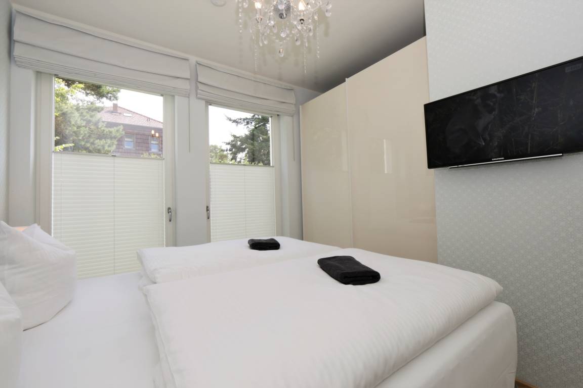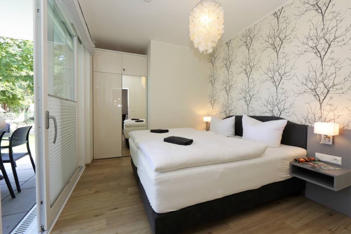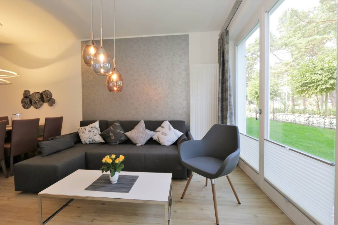 Diese moderne und mit viel Liebe zum Detail eingerichtete 3-Zimmer Wohnung ist 62 qm groß und liegt im Erdgeschoss. Sie bietet für bis zu 4 Erwachsenen und 2 Kindern Platz für einen erholsamen Ostseeaufenthalt direkt am Meer. Der charmant eingerichtete Wohnraum verfügt über eine gemütliche Sitzgruppe mit Sofa (Liegefläche 160 x 200) und Flat TV. Der Essplatz und die Küchenzeile incl. Geschirrspüler, Ceranfeld, Backofen, Mikrowelle, Kühlschrank etc. sind offen im hinteren Bereich des Wohnraums integriert. Auf der überdachten Terrasse zum Osten genießen Sie ihr Frühstück schon im Freien und haben die Promenade im Blick und auch ein wenig das Meer. Die Schlafzimmer sind jeweils mit einem komfortablen Boxspringbett mit getrennten Matratzen (90 x 200), ausreichend Schrankraum und einem zusätzlichen TV eingerichtet. Das großzügige, moderne Bad ist mit einer ebenerdigen Dusche und Waschtisch/WC ausgestattet.