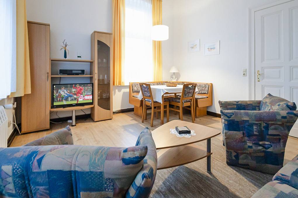 D 12.7 Wohnung 1-3 Pers. : 2-Zimmerwohnung im Parterre mit 38 qm Wohnfläche. Eingangsbereich mit Kleiderschrank. Großer heller Wohn-/Essraum mit gemütlicher Couchgarnitur (Ausziehcouch 2 Pers.), Kabel-TV, Esstisch. Doppelzimmer mit Küchenzeile (2-Platten-Ceranfeld). Modernes Bad: ebenerdige Dusche, Wb, WC. Außensitzplatz mit Bistro-Tisch, Stühlen.