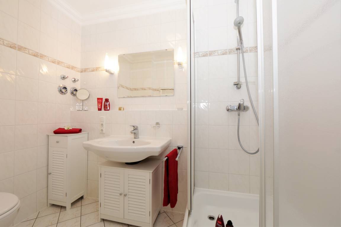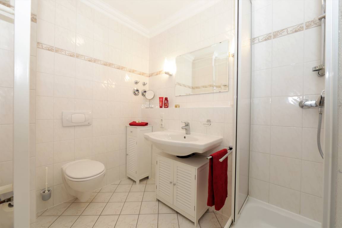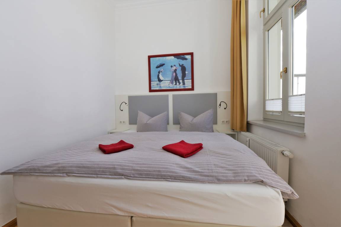 Diese hochwertig und modern eingerichtete 47 qm große Zwei-Zimmer Wohnung liegt im Erdgeschoss und bietet 2 Personen viel Platz für einen entspannten Urlaub. Das Wohnzimmer ist mit einer großzügigen Ledersitzecke, Couchtisch und TV eingerichtet. Hier schweift der Blick in die verkehrsruhige, aber zentral gelegene Bismarckstraße bis zum Meer hinunter. Ein separater Essplatz im Wohnraum grenzt an die offene Küche mit Ceranfeld, Spülmaschine, Kühlschrank mit Gefrierfach und Backofen. Das Schlafzimmer ist mit einem Boxspringbett mit getrennten Matratzen (durchgängiger Topper 180 x 200) und reichlich Schrankraum ausgestattet. Vom Schlafzimmer begehbar ist der Balkon in Richtung Süden, der die Gäste bereits zum Frühstück ins Freie lockt. Darüber hinaus steht den Gästen ein Duschbad mit Waschbecken/WC zur Verfügung.