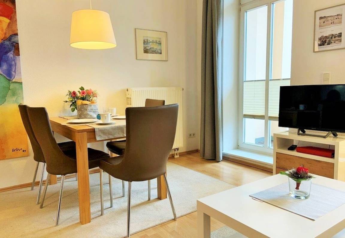 Die geschmackvoll eingerichtete, neu ausgestattete Komfortwohnung befindet sich in direkter Strandlage an der Promenade. Mit wenigen Schritten erreichen Sie das Meer. Die historische Seebrücke ist nur ca. 300 m entfernt. Die im Erdgeschoss gelegene Wohnung ist hochwertig und modern ausgestattet. Sie bietet auf 48 m² mit 2-Zimmern reichlich Platz für 2-4 Personen. Große Fenster und hohe Decken geben ein lichtes Raumgefühl. Ein kostenfreier W-LAN-Zugang, handsignierte Bilder und viele originelle Details runden den Urlaubskomfort ab. Im Wohnbereich befindet sich die gemütliche Sitzecke mit Ledersofa, Flachbildfernseher sowie Radio/CD-Player. Der Essbereich bietet Platz für 4 Personen. Vom Balkon, der vom Wohnraum betreten wird und zur Promenade ausgerichtet ist, gibt es den ganzen Tag Interessantes zu beobachten. Die moderne Vollküche mit Geschirrspüler, Backofen mit Ceranfeld, Kühlschrank, Mikrowelle pp. ist offen im Wohnraum integriert. Sie bietet mit ihrer großen Arbeitsplatte einen zusätzlichen Sitzplatz. Das geräumige helle Schlafzimmer verfügt über ein Doppelbett mit getrennten Matratzen (90 x 200) und einen zusätzlichen Flachbildfernseher. Es befindet sich dort ein Garderobenschrank mit Spiegel sowie eine große Kommode. Für Kleinkinder ist ein Kinderbett vorhanden. Das Badezimmer ist mit Dusche, WC und einem Haartrockner ausgestattet. Alle Zimmer gehen von einem kleinen Flur ab. Ein Pkw-Stellplatz in der Doppelparkergarage (max. Höhe 1,50 m, Länge 5,00m) befindet sich auf dem Grundstück und ist dem Appartement zugeordnet. Für Fahrräder gibt es ebenfalls Stellplätze.