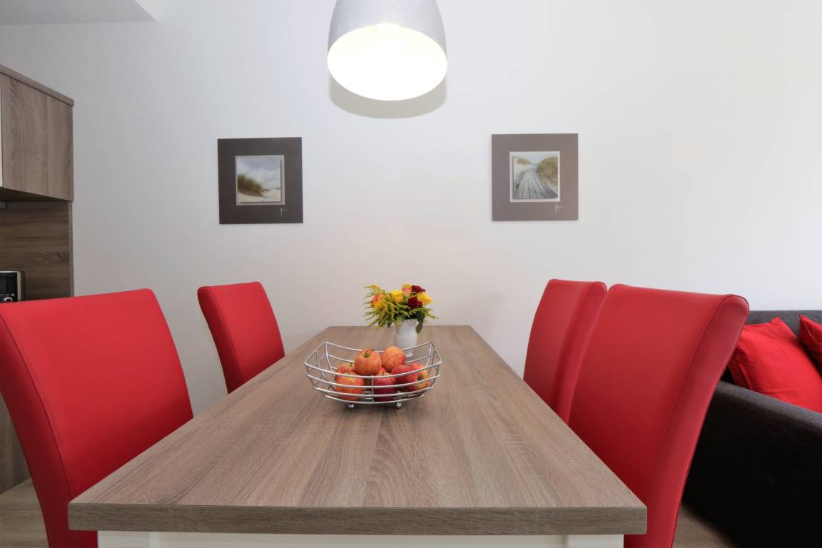 Dieses moderne 2-Zimmer Appartement ist 52 qm groß und befindet sich im 2. Obergeschoss der 2018 neu erbauten Strandresidenz. Die Wohnung ist für 2-4 Personen geeignet. Im Wohnbereich erwartet Sie eine bequeme Polstergarnitur mit Couchtisch und Flat TV sowie ein Esstisch für gemeinsame Mahlzeiten. Die moderne Küche mit Cerankochfeld, Backofen, Mikrowelle, Geschirrspülmaschine, Kühlschrank, Tiefkühlschrank etc. ist ebenfalls offen im Wohnraum integriert. Über den Wohnbereich sowie das Schlafzimmer erreichen Sie den zum Süden ausgerichteten überdachten Balkon, der viele Sonnenstunden verspricht. Das Schlafzimmer verfügt über ein Doppelbett mit getrennten Matratzen (90 x 200), und einen Kleiderschrank. Das großzügige moderne Badezimmer ist mit einer bodengleichen Dusche mit Echtglasabtrennung und Waschtisch/WC ausgestattet.