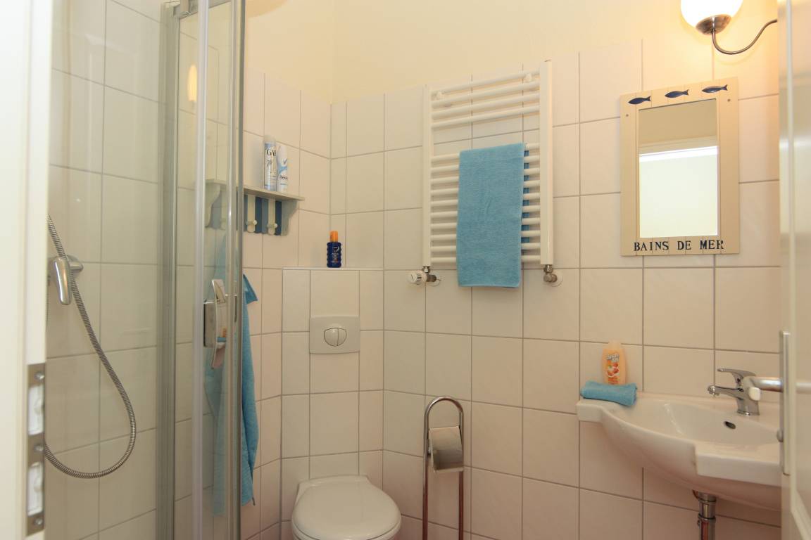 Dieses ca. 48 qm große 2-Zimmer-Appartement liegt im 1. Obergeschoss und ist für maximal 4 Personen geeignet. Im gemütlichen Wohnraum finden die Gäste eine Sitzgarnitur mit TV sowie die offene Vollküche inclusive Geschirrspüler, Cerankochfeld, Kühlschrank, Mikrowelle etc. An dem großen Esstisch in der geräumigen hellen, geschlossenen Loggia (Fenster lassen sich öffnen), die zum Süden gerichtet ist, können die Mahlzeiten eingenommen werden. Das Schlafzimmer ist mit einer Doppelliege mit getrennten Matratzen (90 x 200) und reichlich Schrankraum ausgestattet. Im Badezimmer stehen Dusche, Waschbecken/WC zur Verfügung.