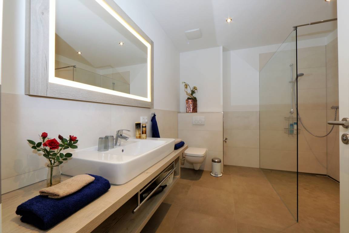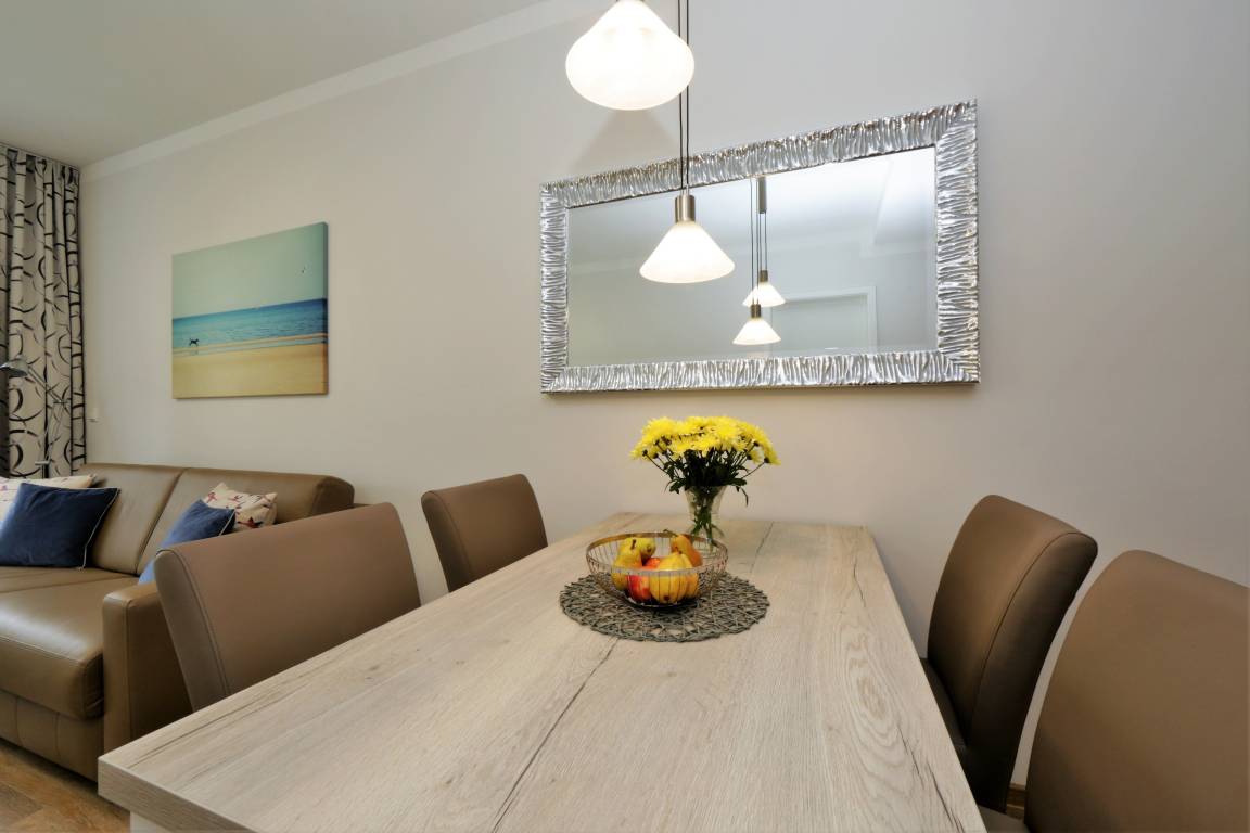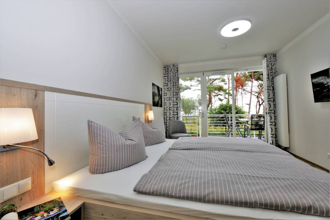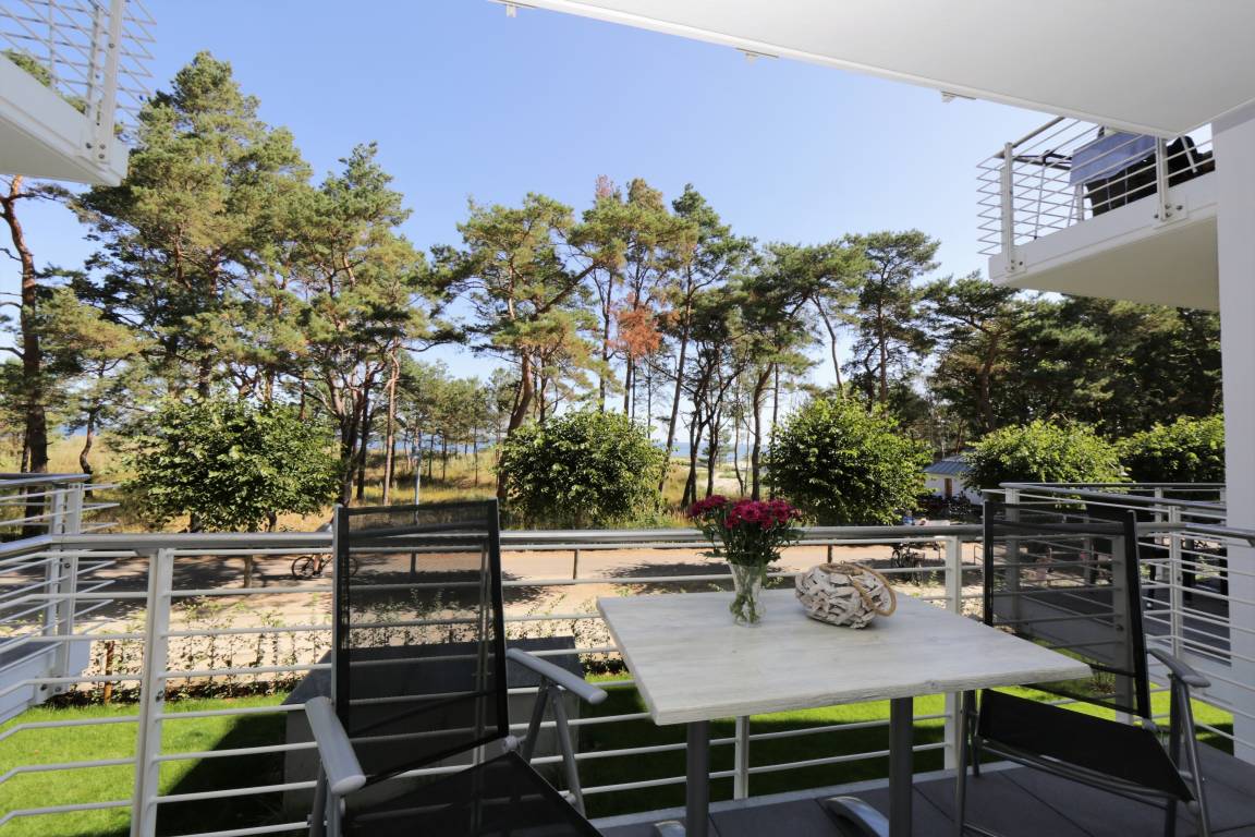 Die moderne hochwertige 2-Zimmer Ferienwohnung mit 58 m² Wohnfläche befindet sich im 1. Obergeschoss der Strandresidenz. Der überdachte Balkon zur Promenade mit traumhaftem Seeblick lockt die Gäste schon zum Frühstück ins Freie. Die Wohnung ist individuell, komfortabel und mit viel Liebe zum Detail eingerichtet. Sie bietet 2-4 Personen Platz für einen erholsamen Urlaub am Meer. Der offene Wohnraum bietet Ihnen eine gemütliche Sitzecke mit einem bequemen Ledersofa mit Schlaffunktion (Matratze 160 x 200), einen Sessel und Flat TV. Die Küchenzeile incl. Backofen, Induktionsfeld, Kühlschrank, Geschirrspüler, Mikrowelle etc. sowie der Essplatz sind offen im Wohnraum integriert. Das geräumige Schlafzimmer ist mit einem Doppelbett mit getrennten Matratzen (90 x 200), einem großen Kleiderschrank und zusätzlichem Flat TV eingerichtet. Um den Sonnenaufgang zu beobachten, müssen Sie nicht unbedingt das kuschelige Bett verlassen. Aus beiden Zimmern genießen Sie den Seeblick aus erster Hand. Der Balkon lässt sich sowohl vom Wohn- als auch vom Schlafzimmer betreten. Das großzügige, moderne Bad ist mit einer ebenerdigen Dusche und Waschtisch/WC ausgestattet.