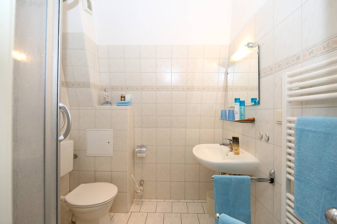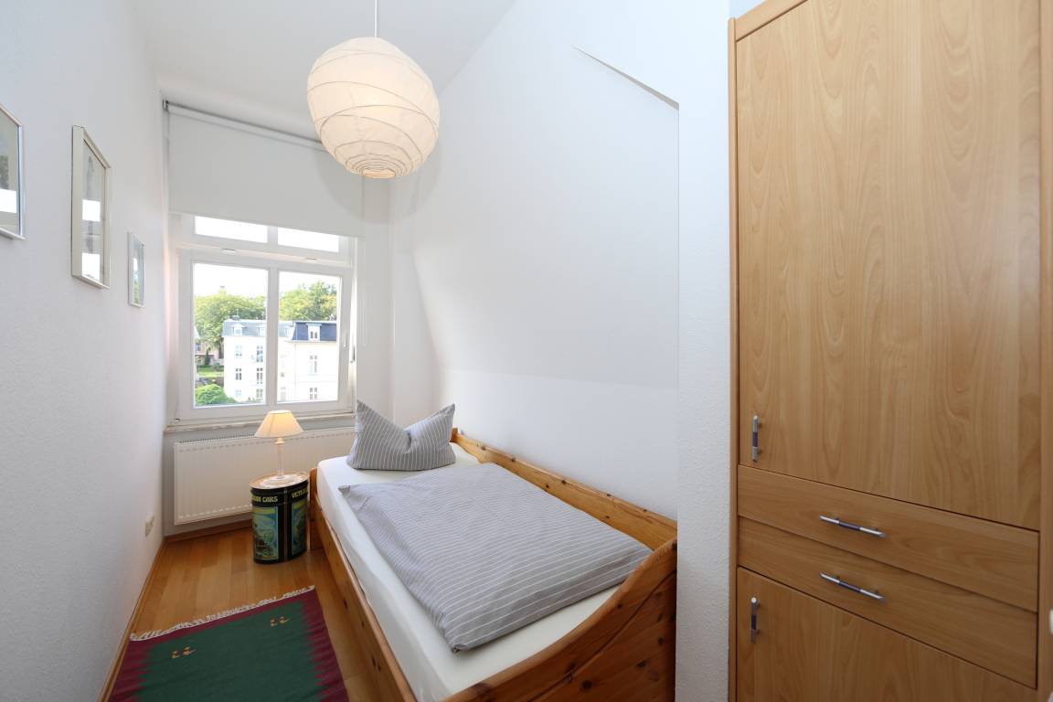 Dieses 58 qm große Appartement ist eine 3-Zimmer-Wohnung im 2. Obergeschoss mit herrlichem Ostseeblick. Im Wohnzimmer lädt eine gemütliche Couch mit Sessel zum Entspannen und Fernsehen ein. Die lichtdurchflutete, geschlossene Loggia (Fenster lassen sich öffnen) zum Westen schließt sich offen direkt an die Sitzgruppe an und beherbergt einen Essplatz für bis zu 4 Personen. Von hier aus können Sie einerseits einen herrlichen Blick auf die Promenade und das Meer genießen, andererseits jedoch auch den schönen Blick in den Garten. Die Küchenzeile mit Kühlschrank, Geschirrspüler, Backofen, Cerankochfeld etc. ist ebenfalls offen im Wohnraum integriert. Das Schlafzimmer ist mit einem Doppelbett mit getrennten Matratzen (80 x 200) und einem Kleiderständer, ein zweites kleineres Schlafzimmer ist mit einem Einzelbett (90 x 200) und einem Schrank eingerichtet. Das Bad ist mit Dusche und Waschbecken/WC ausgestattet. Waschmaschine und Trockner sind im Haus vorhanden. Ein Pkw-Stellplatz befindet sich auf dem Grundstück.