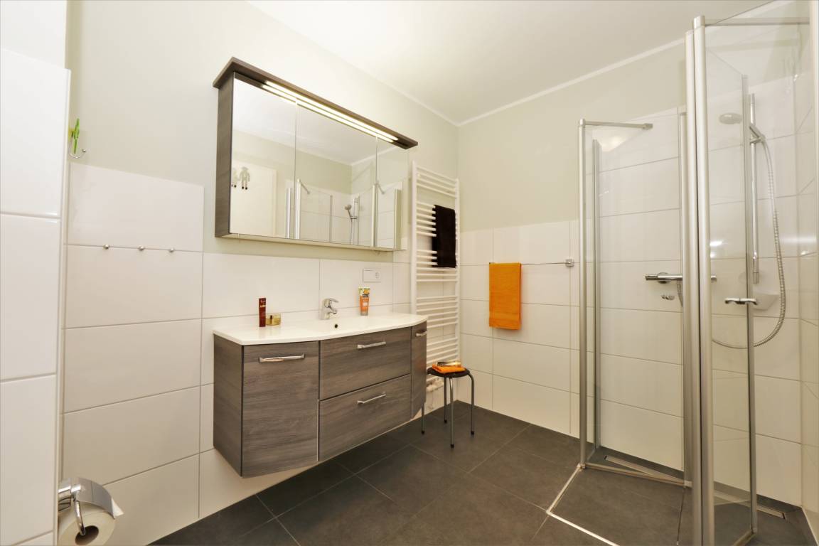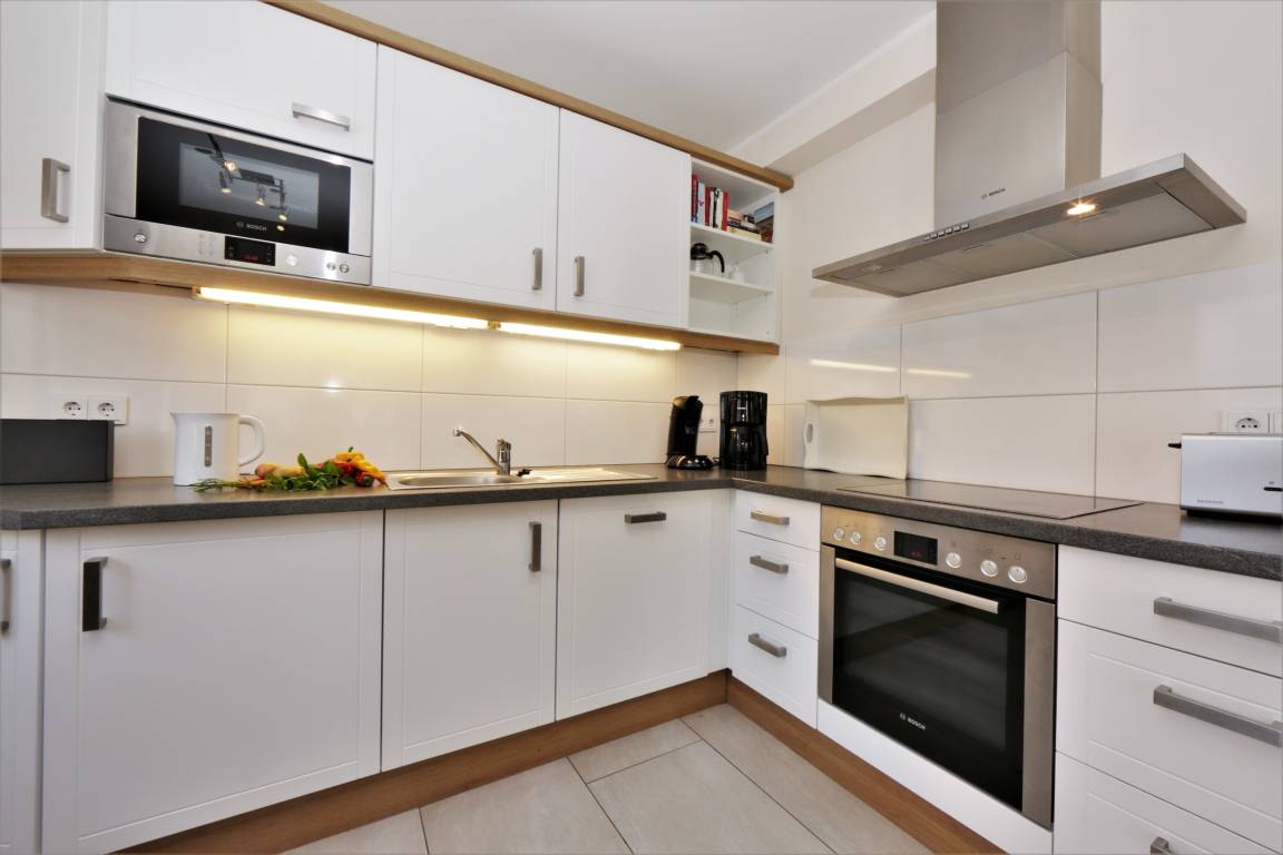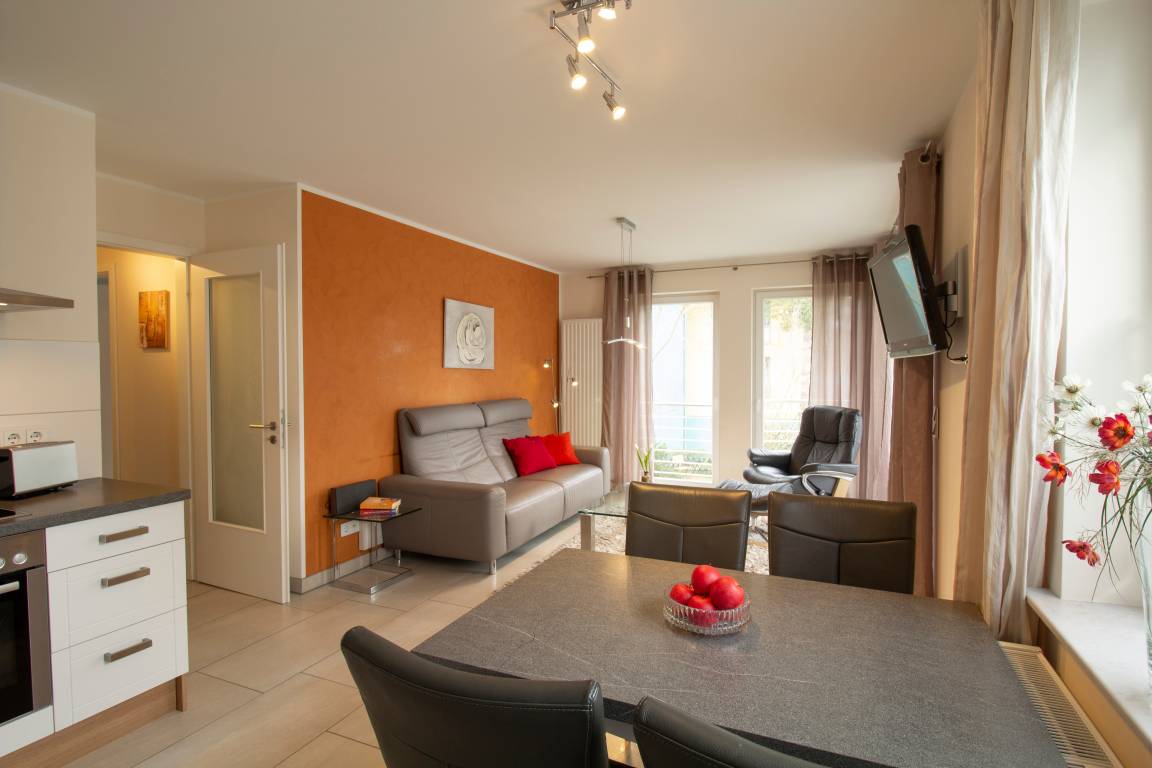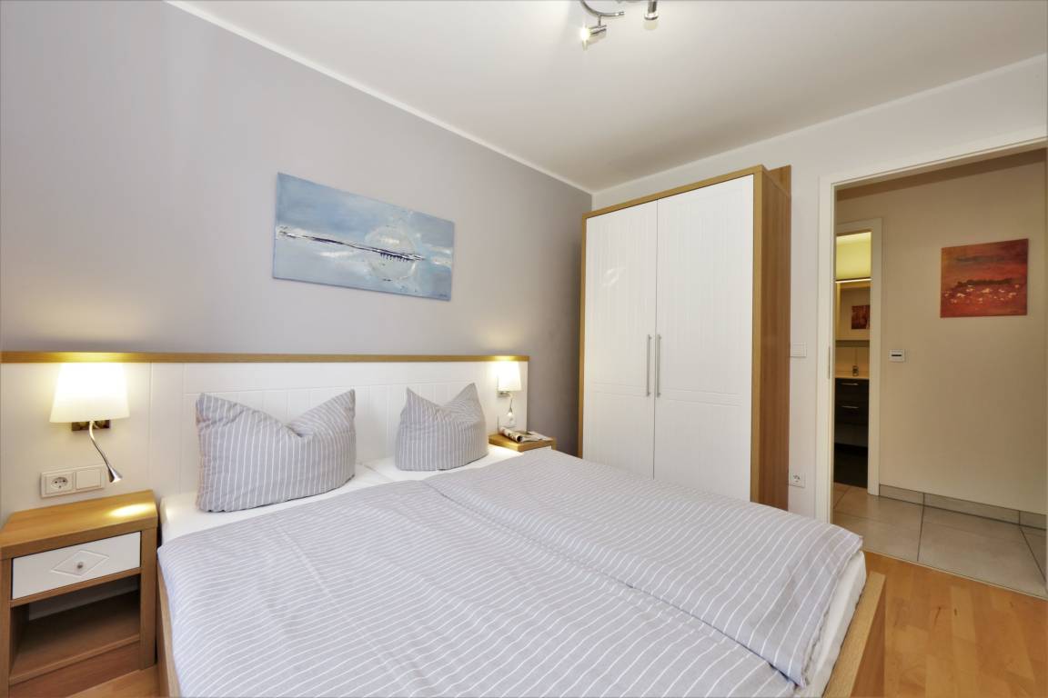 Der hell eingerichtete Wohnraum verfügt über eine gemütliche Sitzecke und einen separaten Essplatz. Eine im Wohnbereich integrierte Küchenzeile mit Geschirrspüler, Backofen, Mikrowelle p.p komplettiert die Wohnung. Beide Schlafzimmer sind mit Doppelbett (1x 1,80x2,00m bzw. 1x 1,60x2,00m) und genügend Schrankraum ausgestattet. Ein Duschbad sowie ein Gäste WC runden diese Wohnung ab. Als Highlight verfügt diese Wohnung über einen geräumigen Balkon mit teilweise Seeblick. Der Pkw-Stellplatz befindet sich in der Tiefgarage und ist der Wohnung zugeordnet. Fahrräder können im Keller untergestellt werden.