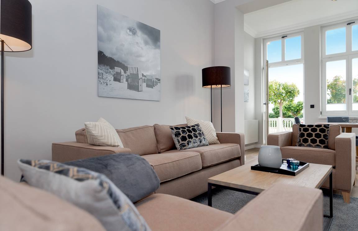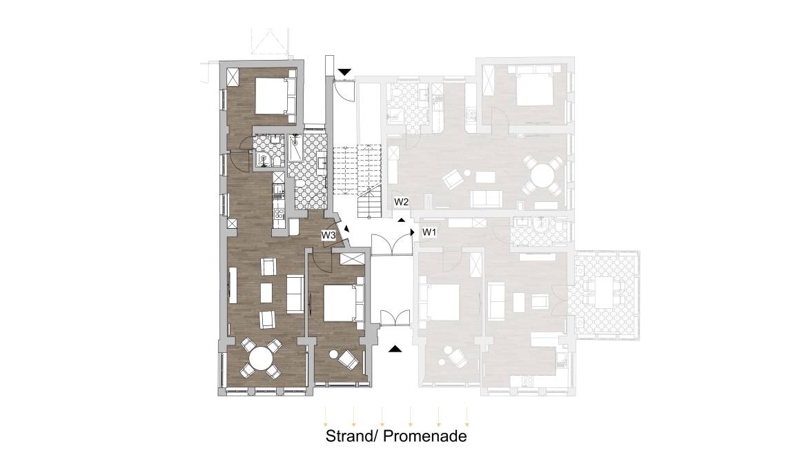 Die Wohnung "Wolgastsee" bietet mit ihren 3 Zimmern und ca. 80 qm für bis zu 4 Personen Platz in einem stilvollen, hellen und modernen Ambiente. 2 separate Schlaf- und Badezimmer ermöglichen eine flexible Belegung. Genießen Sie den Meerblick über große Fensterfronten. Die zur See ausgerichteten, ehemals offenen Veranden wurden für die jahreszeitunabhängige Nutzung ansprechend verglast in die Wohnung integriert. Ein vollausgestatteter Küchenbereich lädt zum gemeinsamen Kochen ein. Haustiere sind in dieser Einheit willkommen.