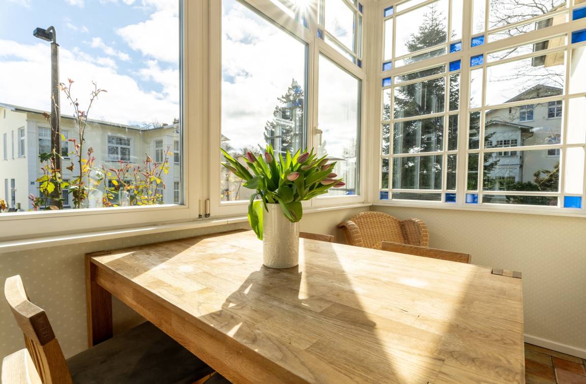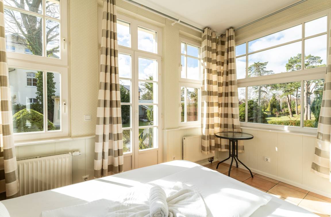 Sie wohnen im Erdgeschoß in einer liebevoll sanierten Villa im Bäderarchitekturstil, in ruhiger und zentraler Lage. Zum Strand sind es nur ca. 100 Meter. Das Appartement ist 129 qm groß und ist mit rustikalen skandinavischen Möbeln ausgestattet. Es bietet insgesamt sechs Schlafplätze. Im Schlafzimmer befinden sich ein großes Doppelbett (200x200) und ein Etagenbett (2x 90x200). In der abgeschlossenen Veranda können Sie auf einem Doppelbett (140x200) ruhen. Ein großer Einbaukamin lädt zum Ausklang eines romantischen Abends ein. Die Böden sind mit rustikalen mediterranen Fliesen ausgelegt. Im modernen Bad sind eine Erlebnisdusche und ein Whirlpool zum Entspannen vorhanden. Weiterhin gibt es kleines separates Gäste-WC. Zwei lichtdurchflutete Veranden laden zum Verweilen ein. Auf zwei großzügigen Terrassen können Sie das weitläufige Grundstück genießen. Am großen Aussengrill kann Leckeres zubereitet werden. Einen separaten Stellplatz finden Sie hinter der Villa. Fahrräder können untergestellt Ausstattung der exklusiven Ferienwohnung Salon lässt keine Wünsche offen. Dazu zählen WLAN, Plasma-TV, DVD-Surroundanlage, DVD-Filme, Bücher, Einbauküche mit Geschirrspüler, Kühl-/Gefrierkombination, Backofen mit Ceranfeld, Mikrowelle, Kaffeemaschine, Senseo-Kaffeepadmaschine, Wassserkocher, Toaster, Föhn, Babybett, Babyhochstuhl, klappbare Wickelauflage und vieles mehr.