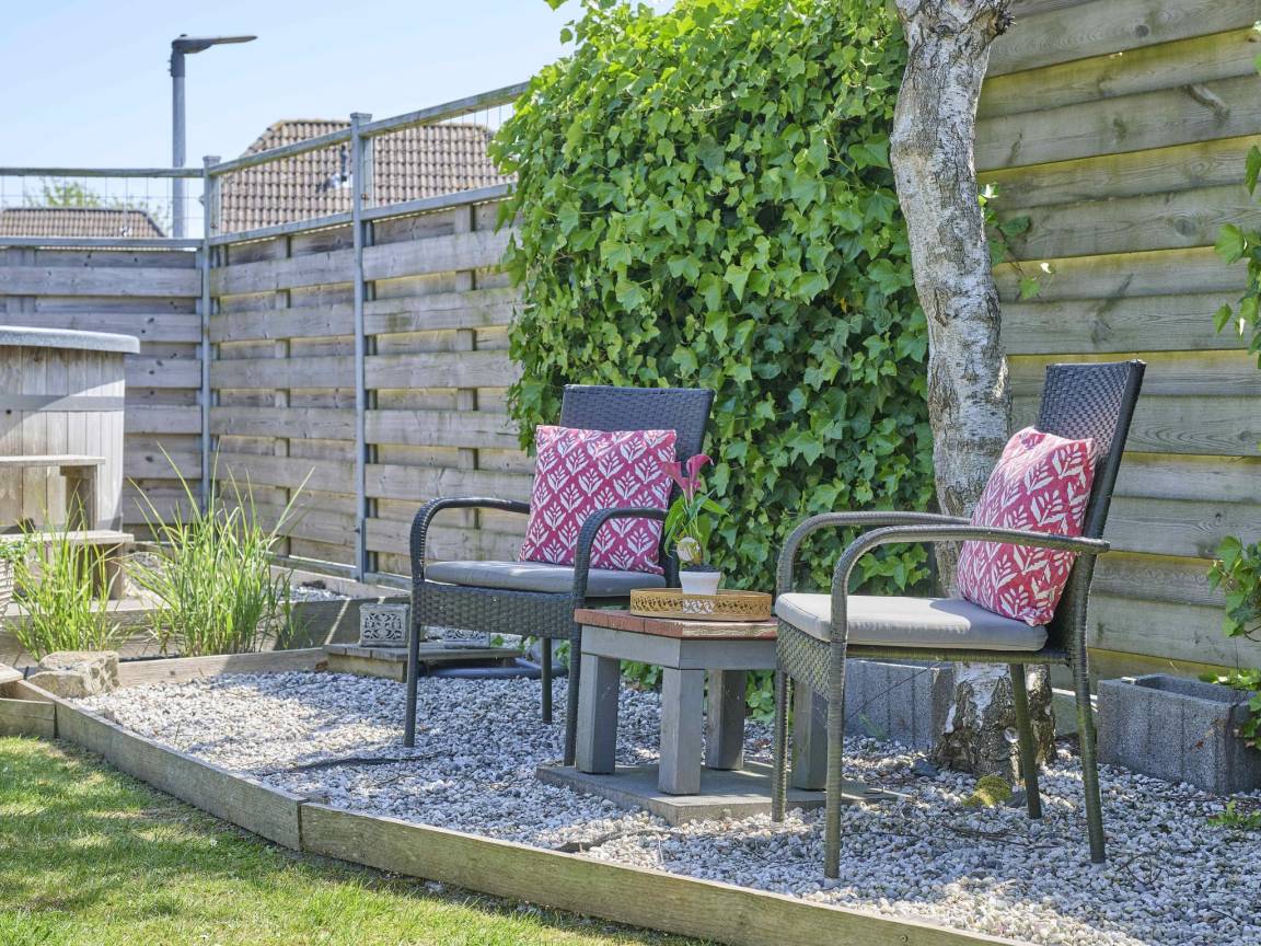 Garten(alleinige Nutzung, angelegt, illuminiert, umzäunt) mit Hottub(feuerbeheizt), Terrasse, 2x Liegestühle, Parasol , Fahrradabstellraum, BBQ(Holzkohle), 2x Parkplatz, 2x Parasol, Bügelbrett, Bügeleisen
