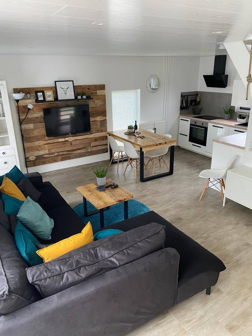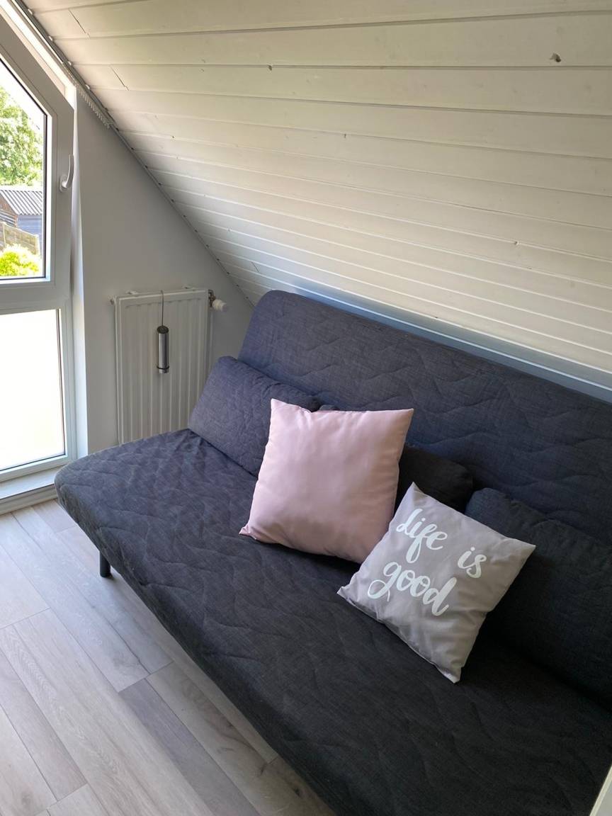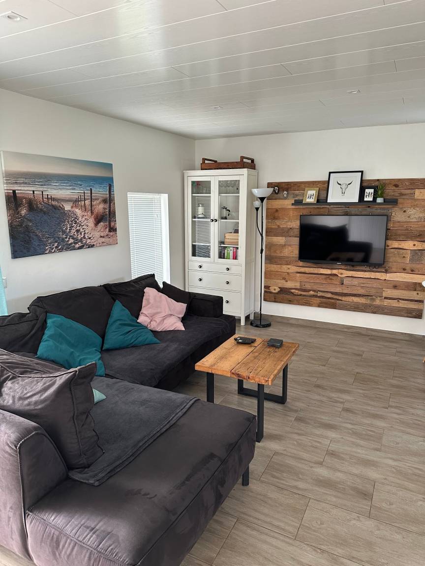 Im Erdgeschoss befindet sich der große gemütliche eingerichtete Wohnbereich mit angrenzender offener Küche und Essecke. Ein Schlafzimmer mit Doppelbett und das Badzimmer sind im Erdgeschoss vorhanden.