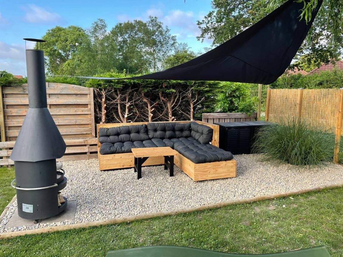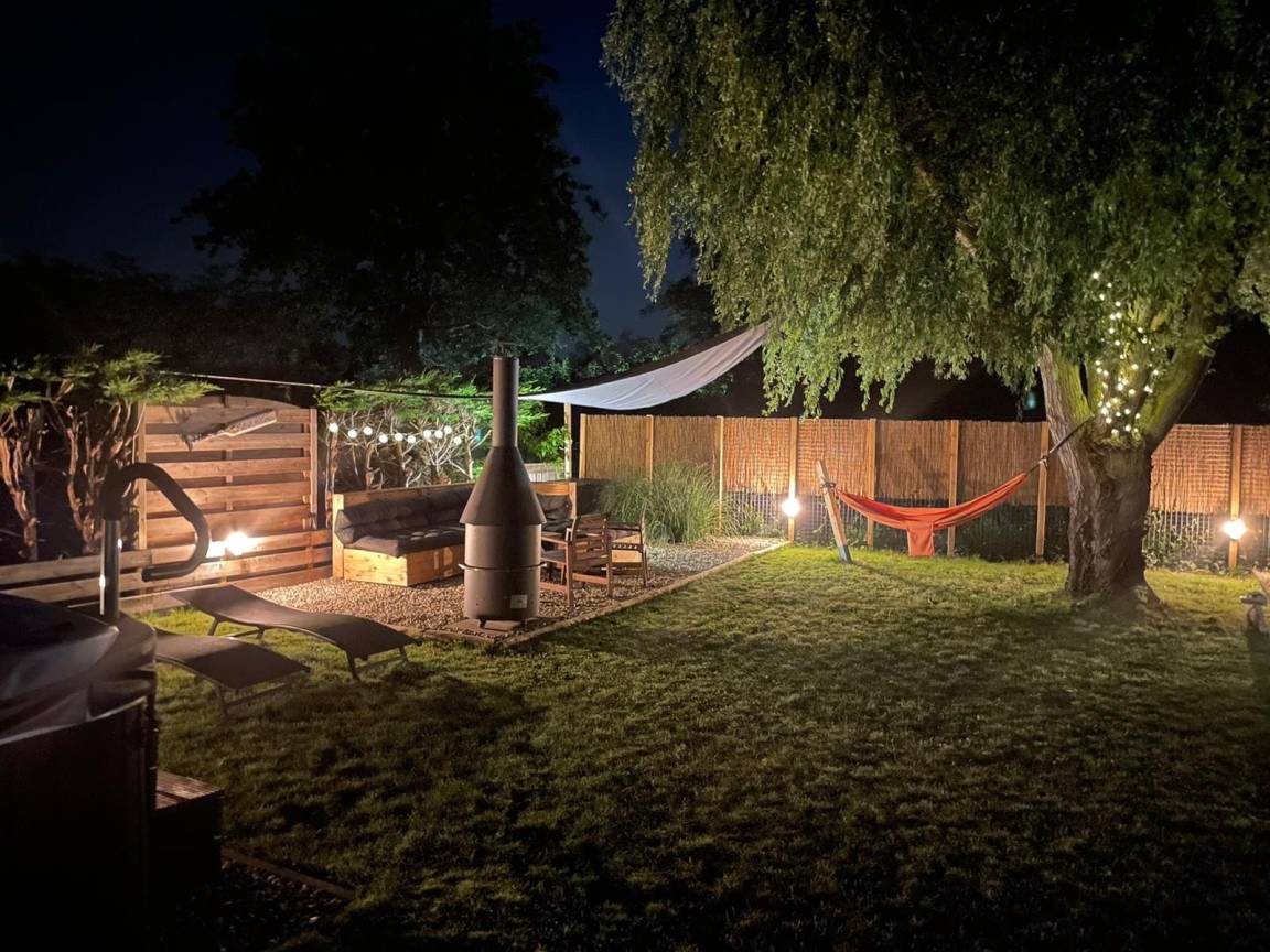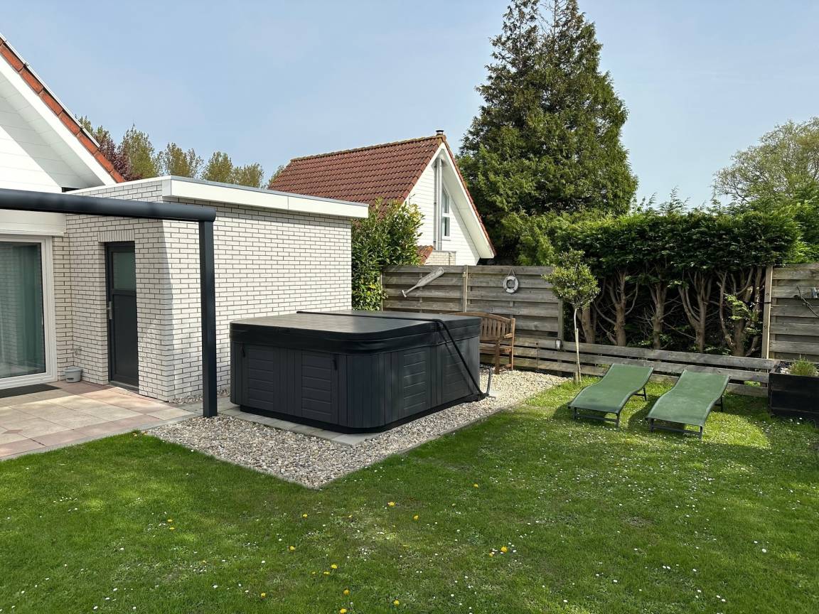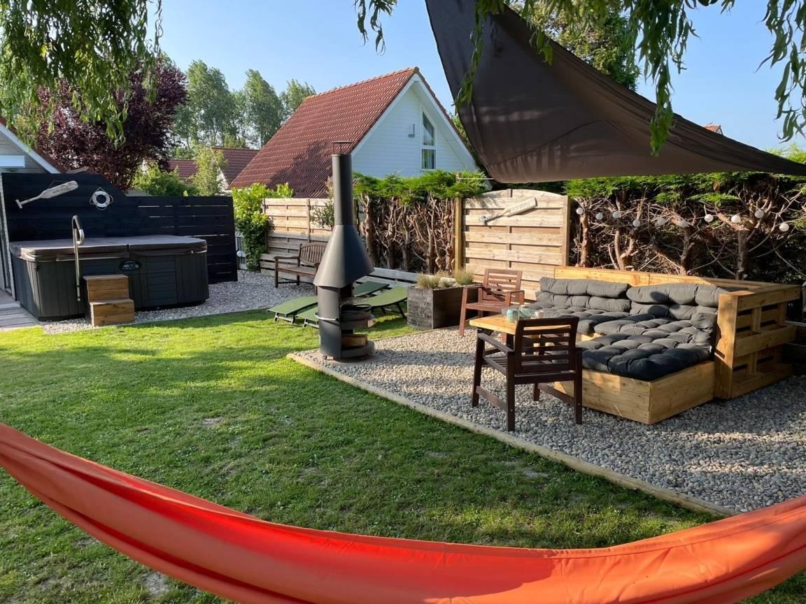 Im Garten gibt es verschiedene Sitzmöglichkeiten die zum Verweilen einladen. Gartenmöbel, Sonnenschirm und ein Grill runden das Angebot ab. Angrenzend an die überdachte Terrasse steht der große Jacuzzi.