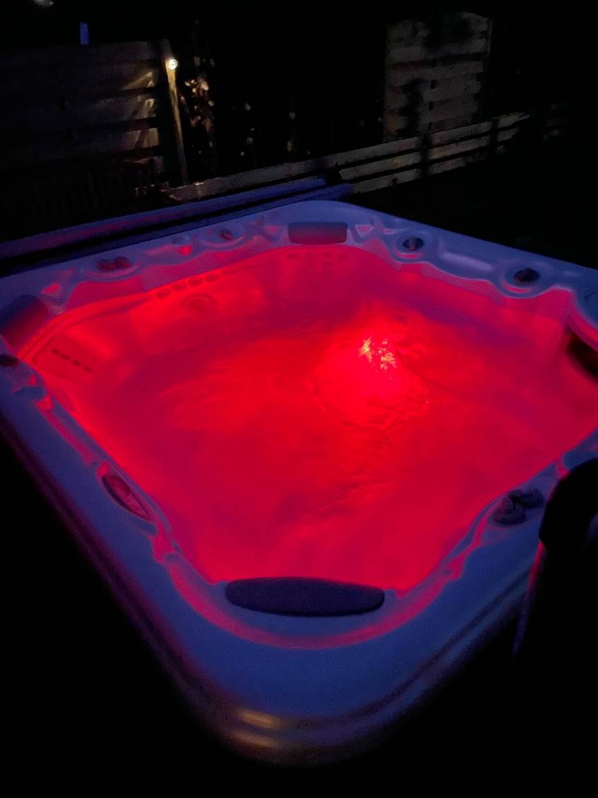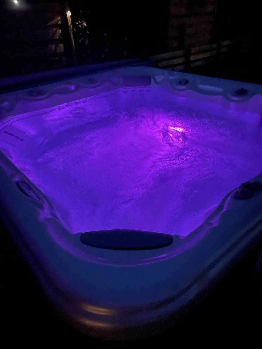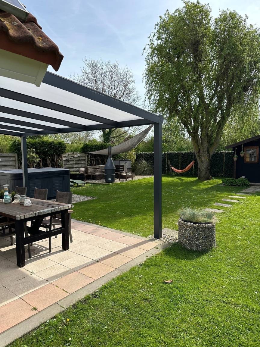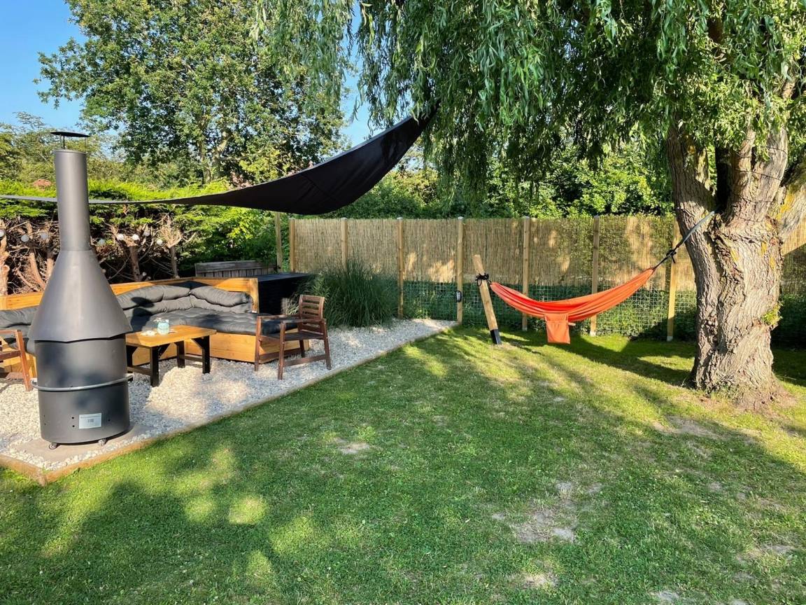 Im Garten gibt es verschiedene Sitzmöglichkeiten die zum Verweilen einladen. Gartenmöbel, Sonnenschirm und ein Grill runden das Angebot ab. Angrenzend an die überdachte Terrasse steht der große Jacuzzi.