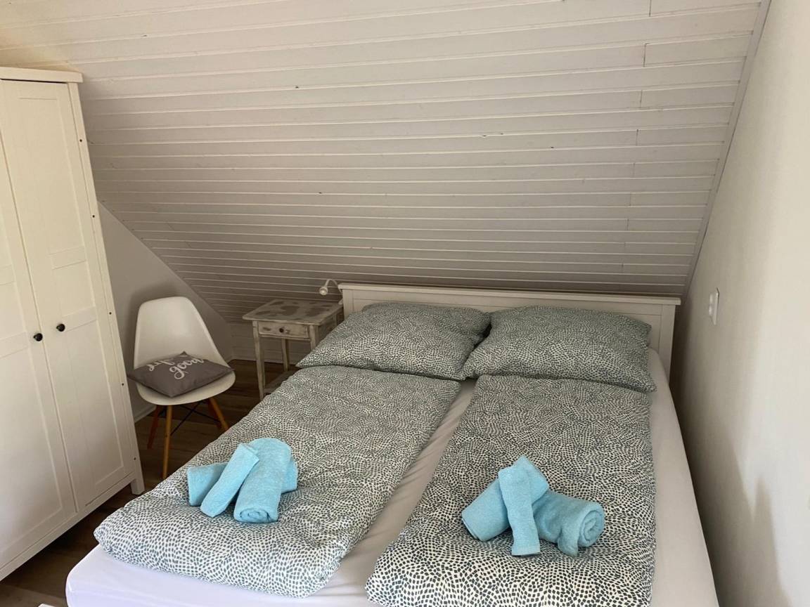 Im rechten Schlafzimmer steht ein Doppelbett und eine Kommode.