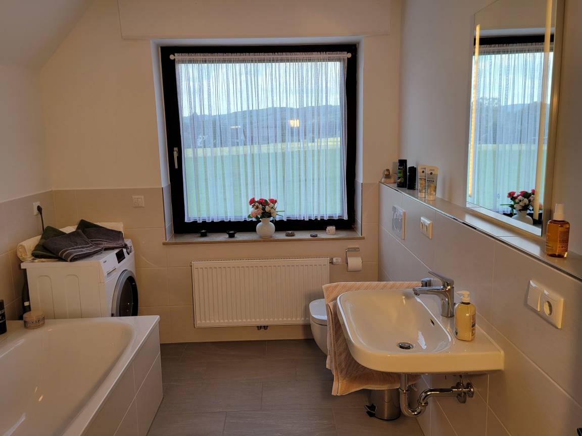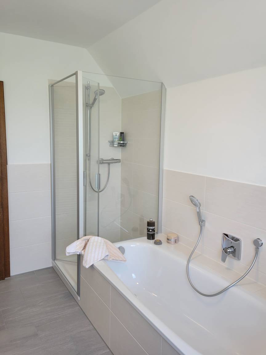 Das frisch renovierte Badezimmer ist mit Badewanne, Dusche und Waschmaschine ausgestattet.
