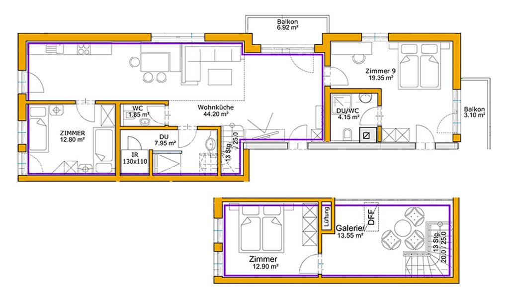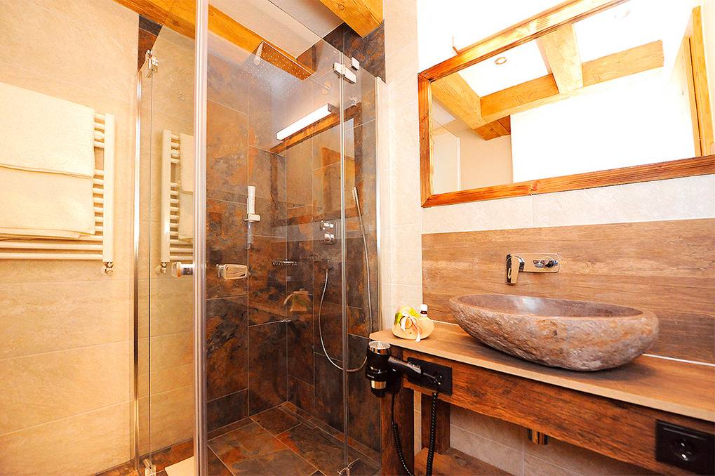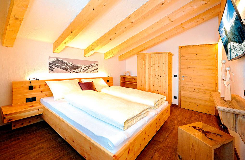 A 371.16 Wohnung 1-6 Pers.: 4-Zimmerwohnung mit 120 qm Wohnfläche über 2 Etagen. 2. Etage: Großzügiger zirbenholzvertäfelter Wohn/-Essraum mit Couchgarnitur, Sat-TV, Esstisch, moderner Küchenzeile (Backofen, Mikrowelle, Spülmaschine), Balkon. 2-Bettzimmer mit Balkon. Doppelzimmer mit Bad (Du, Wb, WC), Balkon. Bad mit Infrarot-Wärmekabine, Du, Wb. Separates WC. Vom Flur Holztreppe ins Dachgeschoss (Schrägen): Sitzecke auf Galerie mit Sat-TV. Doppelzimmer mit Balkon.