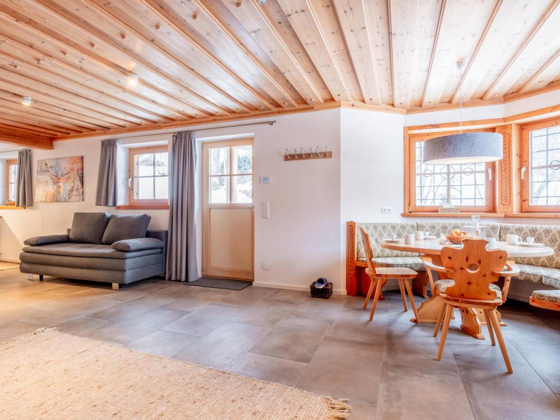 Hausbeschreibung : Im Erdgeschoss, auf der Gartenseite, beherbergt dieses freistehende Chalet zwei geräumige Wohnungen. Beim Betreten fällt sofort der große Wohnraum ins Auge. Der Esstisch mit Rundsofa ist in den Erker eingebaut. Das sorgt für viele gemütliche Momente bei einem leckeren selbstgekochten Essen oder einem Spiel.