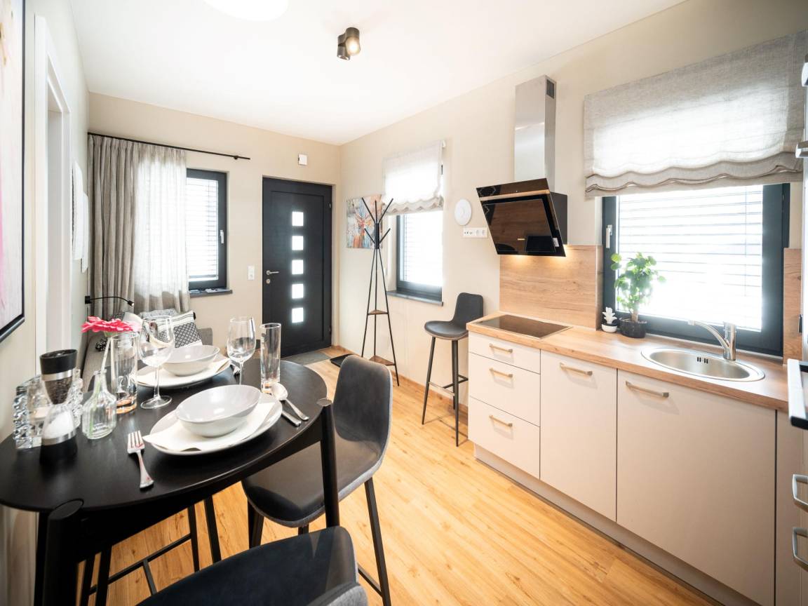Layout : Parterre: Wohnzimmer mit Schlafcouch 1 Pers. , offene Küche mit Esstisch(3 Personen), Kochherd(4 Kochplatten), Kaffeemaschine(cups), Backofen, Mikrowelle, Geschirrspüler, Kühl-/Gefrierkombination , Schlafzimmer mit Doppelbett, TV , Badezimmer mit Dusche, Waschbecken, Toilette, Föhn