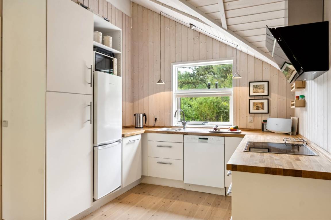 „The vacation at the holiday home: Et skønt sommerhus i dejlige omgivelser. God afstand til stranden. Vi savnede dog et par solstole og at udemøblerne ikke var så slidte. Fx faldt en stol sammen, da der blev siddet på den. Der manglede en dyvel, så vi siden. Inventaret var slidt, men godt. Sengene i det ene soveværelse, sovesofa, var meget umagelige, og bestod faktisk kun af to madrasser lagt oven på hinanden. Køjerummet var fint, men kunne have ønsket to enkeltsenge i det andet soveværelse. Alt var rent og pænt og badeværelserne meget fine. Bestik og tallerkener var slidt og der var kun få drikkekrus. Vi købte 5 krus, som blev stående. Alt i alt var vi lykkelige for at være i huset, som var ugenert og rummeligt. Vi var de fleste dage kun 2 personer, men en weekend kom vores yngste søn, hans kone og barn. Så måtte vi vaske op meget ofte! Departure and follow up: Vi finder det godt, at man kan få nøgle i en nøgleboks. Har før lejet et andet sommerhus, hvor vi skulle køre en halv time til et kontor for at få nøglen. Når man i forvejen har kørt langt fra sit hjem, er det skønt at kunne tage direkte hen til sommerhuset og få nøglen i boksen med kode. The holiday home itself: Skønt hus i dejlige ugenerte omgivelser. Pænt stand, rent og pænt møbleret. For lidt pænt bestik og porcelæn. Vi kunne godt have brugt 2 nøgler. Jeg tabte en nøgle i stor revne foran hoveddøren. Heldigvis var døren ikke låst. Jeg fiskede i lang tid efter den, og med en grill tang fik jeg den op. Så satte jeg bagefter en stor nøglering i, så det ikke gentog sig! Vi nød vores ferie rigtig meget, og vil sikkert gerne leje det en anden gang.“
