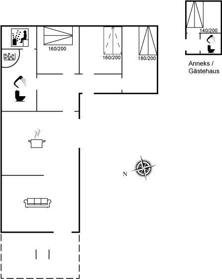 SchlafverhältnisseDie Schlafplätze verteilen sich auf 4 Schlafräume. 6 Schlafplätze in Doppelbetten. 2 Schlafplätze auf einer Doppelschlafcouch. 2 von diesen Schlafplätzen befinden sich im Gästehaus. Ferner steht ein Kinderbett zur Verfügung.