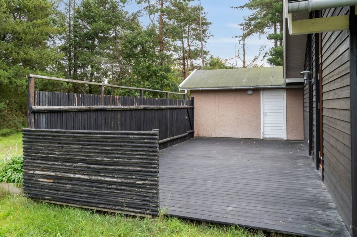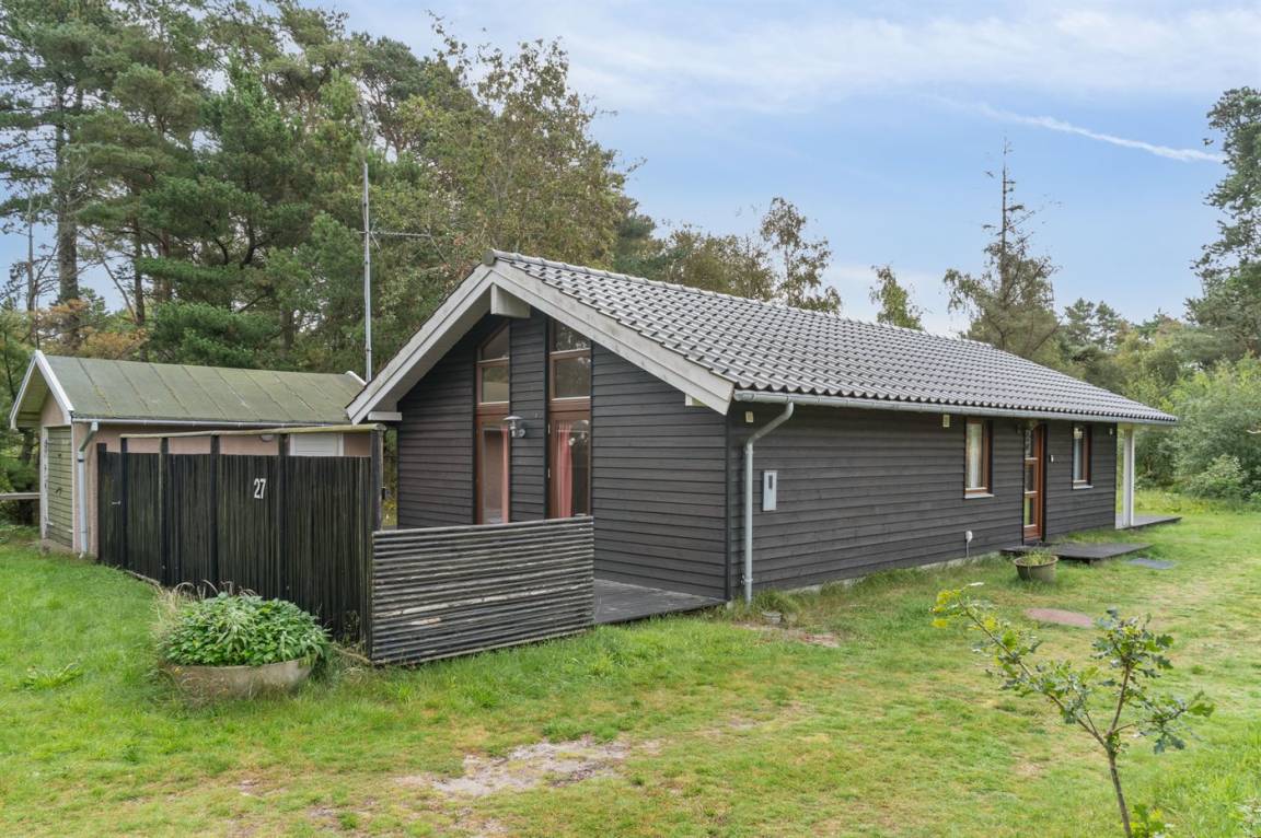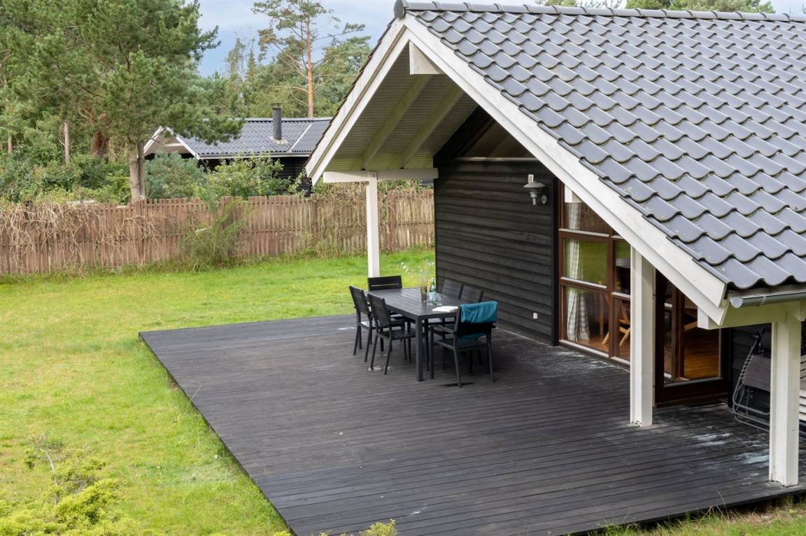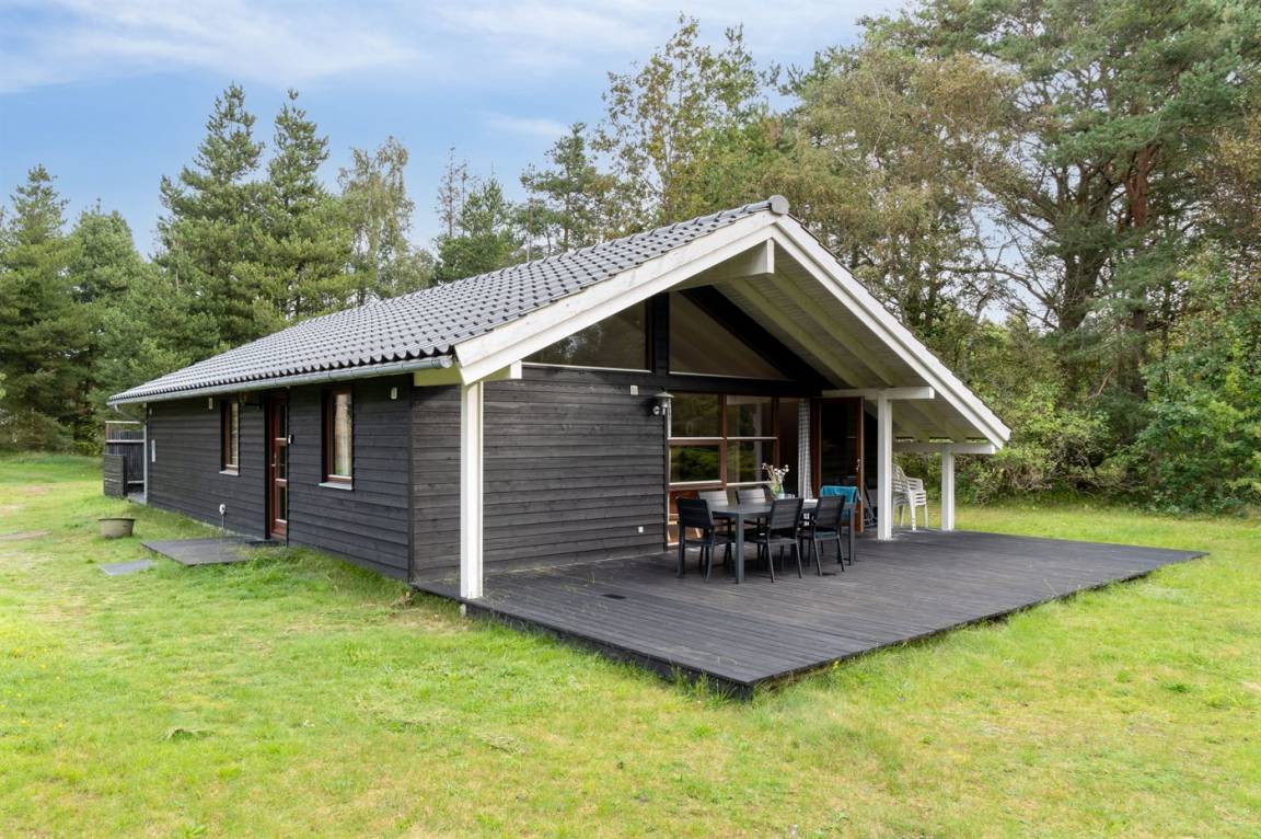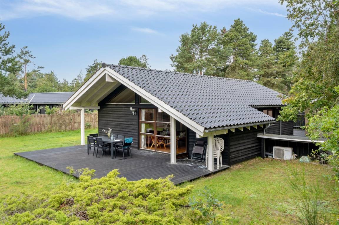 Auf einem großen Wald-/Plantagengrundstück liegt dieses schöne Luxusferienhaus aus Holz, 2008 gebaut, mit nur 400 m zu fantastischem Sandbadestrand mit Sanddünen. Zum Haus gehören mehrere offene Terrassen und ein teilweise überdachte Terrassenareal mit Gartenmöbeln. Innen gibt es Buchenparkettböden, schrägende Holzdecken, teils Holzwände teils verputzte Schieferwände. Nettes Badezimmer mit Duschnische, Fußbodenheizung, 2-Pers.-Whirlpool und direktem Zugang zur Sauna des Hauses. Die offene Küche ist u. a. mit Tiefkühlgerät, Mikrowelle, Geschirrspüler, Herd mit Ceran-Feld und Umluftofen ausgerüstet. Schönes, großes, helles und nett möbliertes Wohnzimmer mit geräumiger Atmosphäre und netten Fenstern sowie schrägenden Decken. Das Wohnzimmer ist mit Wärmepumpe/Aircondition, TV, DVD- und CD-Spieler sowie Radio eingerichtet. Vom Wohnzimmer und allen Zimmern gibt es direkten Ausgang zu den Terrassen. Die Schlafplätze des Hauses verteilen sich auf 2 Zimmer mit Doppelbett sowie 1 Zimmer mit 2 Einzelbetten. Waschmaschine zur Verfügung. Ein sehr hübsches Ferienhaus in einem Gebiet mit vielen Aktivitätsmöglichkeiten, u. a. Golf, Sportangeln und Shopping. Das Haus wird nur an Feriengäste vermietet.