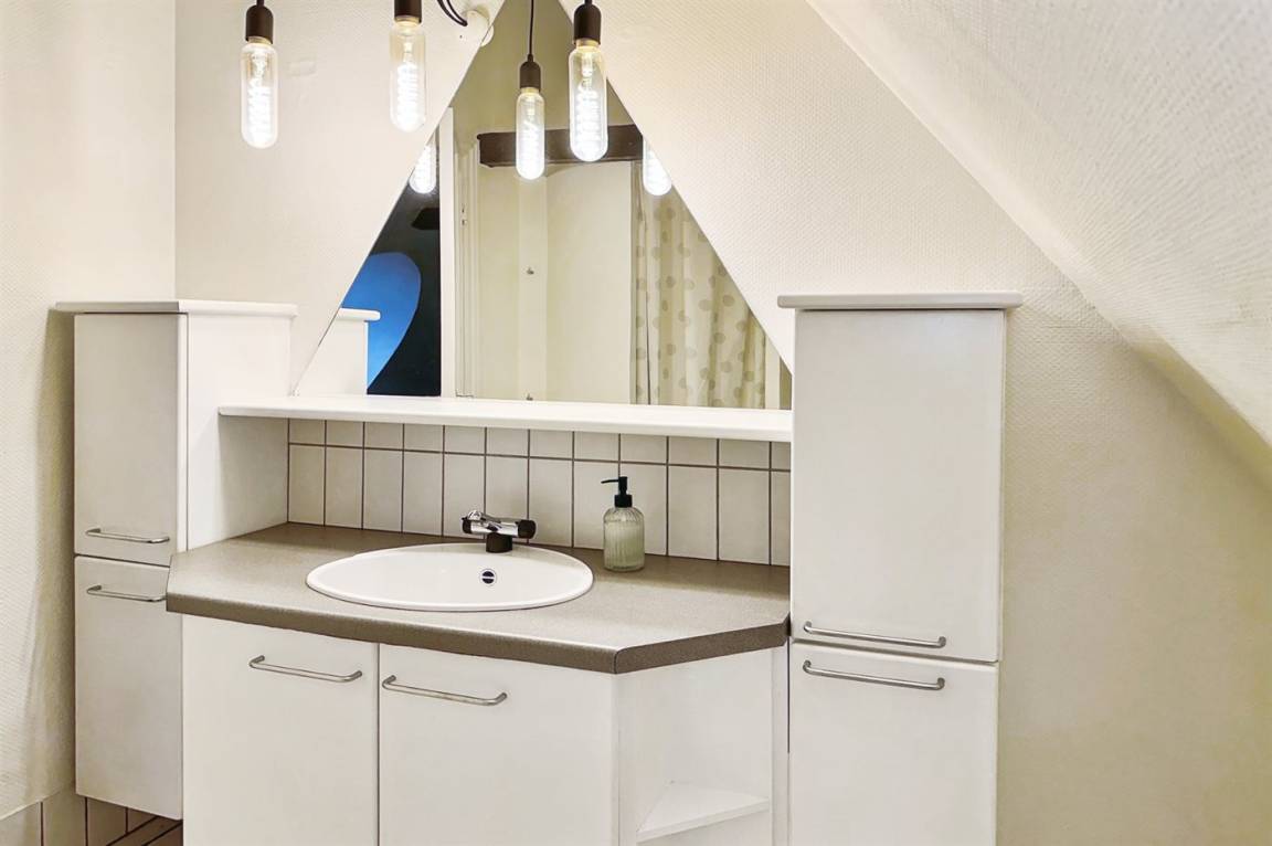 Ein Gasgrill und Gartenmöbel stehen zur Verfügung. Im Erdgeschoss gibt es ein kleines Badezimmer mit Waschmaschine und Wächetrockner, eine separate Küche mit Geschirrspüler und Blick auf den Atriumgarten, ein Esszimmer sowie ein Wohnzimmer mit TV und Kaminofen, ein neues Badezimmer mit Duschnische und ein großes Schlafzimmer mit direktem Zugang zum Atriumgarten.