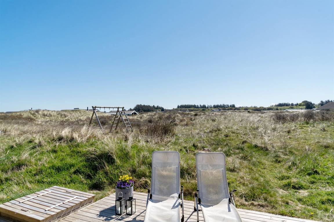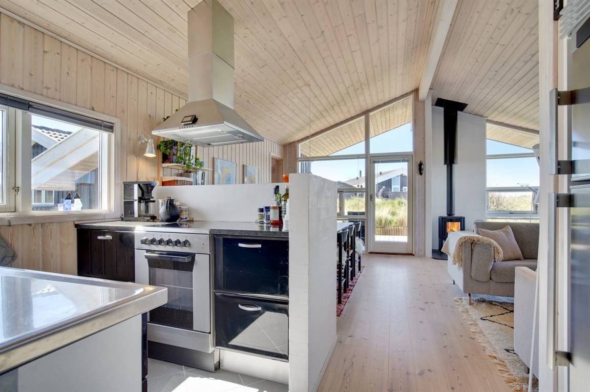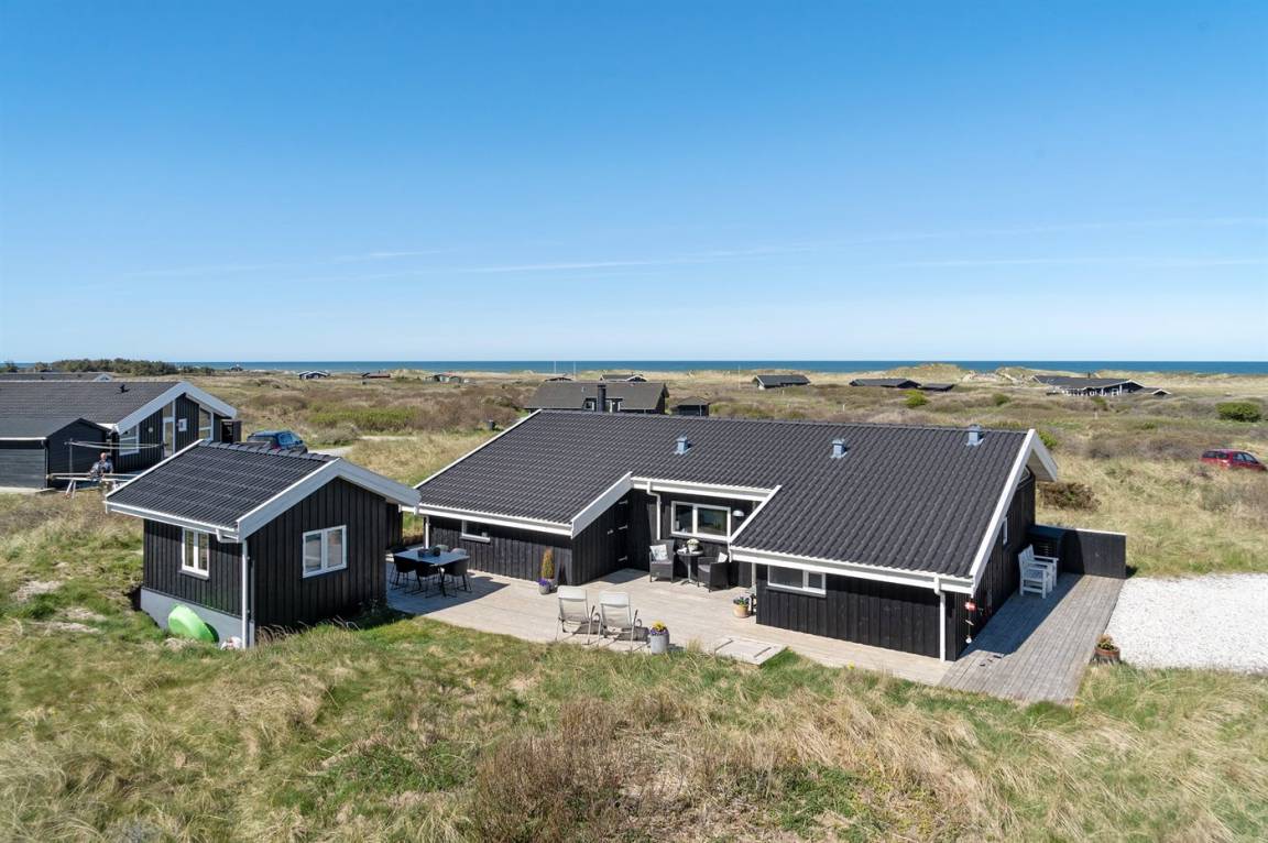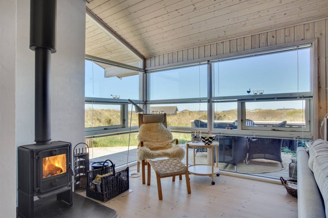 Dieses prachtvolle Ferienhaus liegt auf einem hügeligen Dünengrundstück in Nørlev. Sowohl vom Haus als auch vom Grundstück können Sie das Meer ahnen.