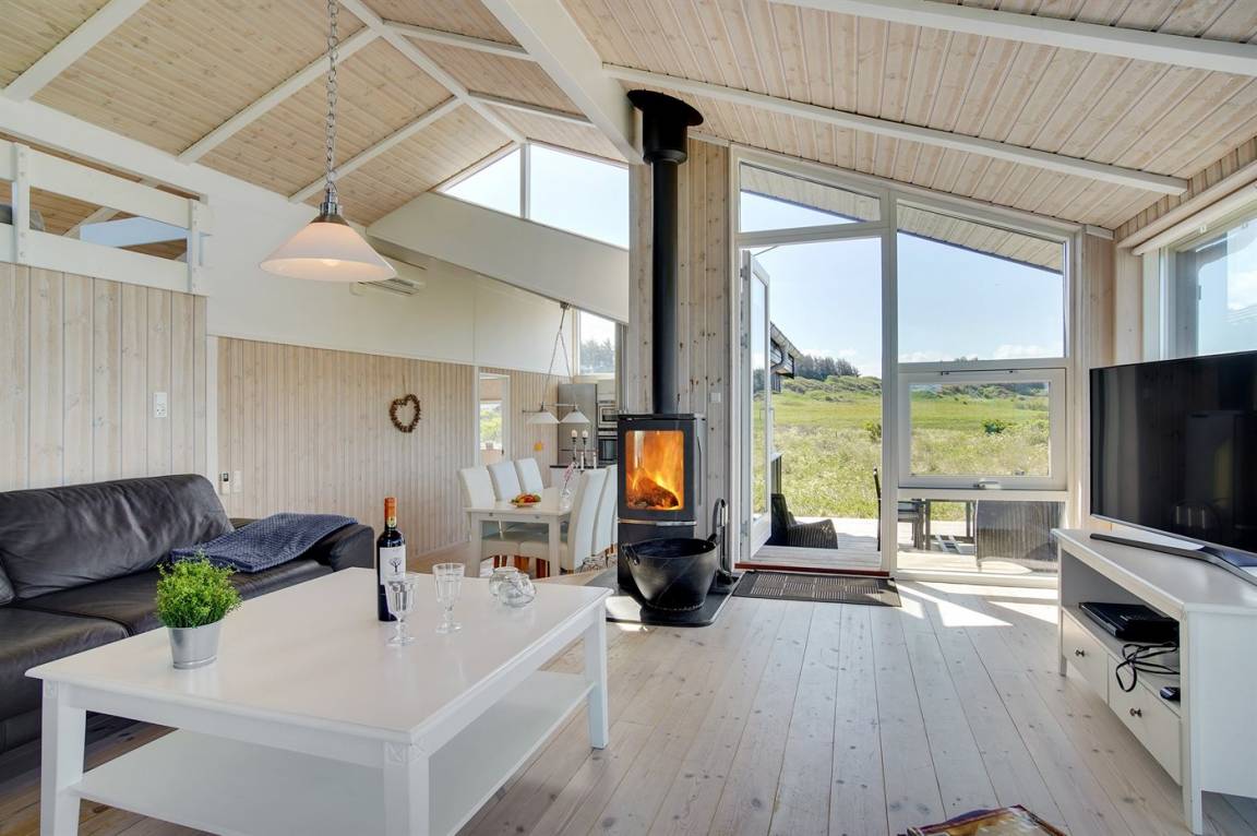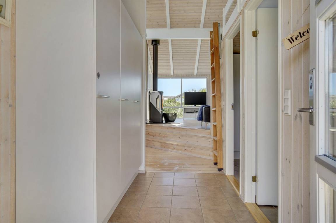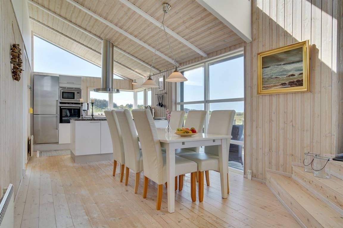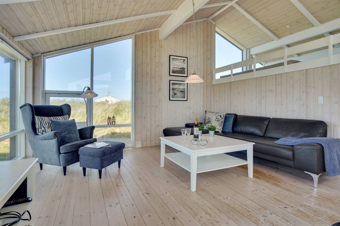Hübsches, neugebautes Luxusferienhaus auf einem schönen Naturgrundstück in Nörlev gelegen. Das Has erscheint hell und freundlich und ist mit allen modernen Bequemlichkeiten eingerichtet. Sowohl vom Haus als auch vom Grundstück haben Sie eine hübsche Aussicht über die Binnenlanddünen. Zum Haus gehört eine schöne Terrasse mit Gartenmöbeln - hier können Sie die Sonne und eine Mahlzeit im Freien genießen. Die moderne Küche mit Essplatz ist u. a. mit Geschirrspüler, Mikrowelle, Tiefkühlgerät, Umluftofen und Herd mit Ceran-Feld ausgestattet. Das geräumige Wohnzimmer mit großer Fensterfront und Zutritt zur Terrasse ist mit Kaminofen, DVD-Spieler, TV und Gemeinschaftsantenne eingerichtet. Die Schlafplätze verteilen sich auf 3 gute Zimmer; 2 mit Doppelbett sowie 1 mit Doppelbett und 1 Kojenplatz. Hübsches Badezimmer mit Fußbodenheizung, Duschnische, 2-Pers. Whirlpool und Zutritt zur Sauna. Ferner stehen kostenlose Internetverbindung (eigener Computer muss mitgebracht werden), Waschmaschine sowie Wäschetrockner zur Verfügung und es ist eine energiegerechte Wärmepumpe installiert. Teils Holzböden, teils Klinkerböden. Ein schönes Ferienhaus in naturschöner Umgebung und im Gehabstand von der Ferienanlage Skallerup Klit Feriencenter mit vielen Sportsaktivitäten, Erlebnisbad und römischem Bad entfernt.