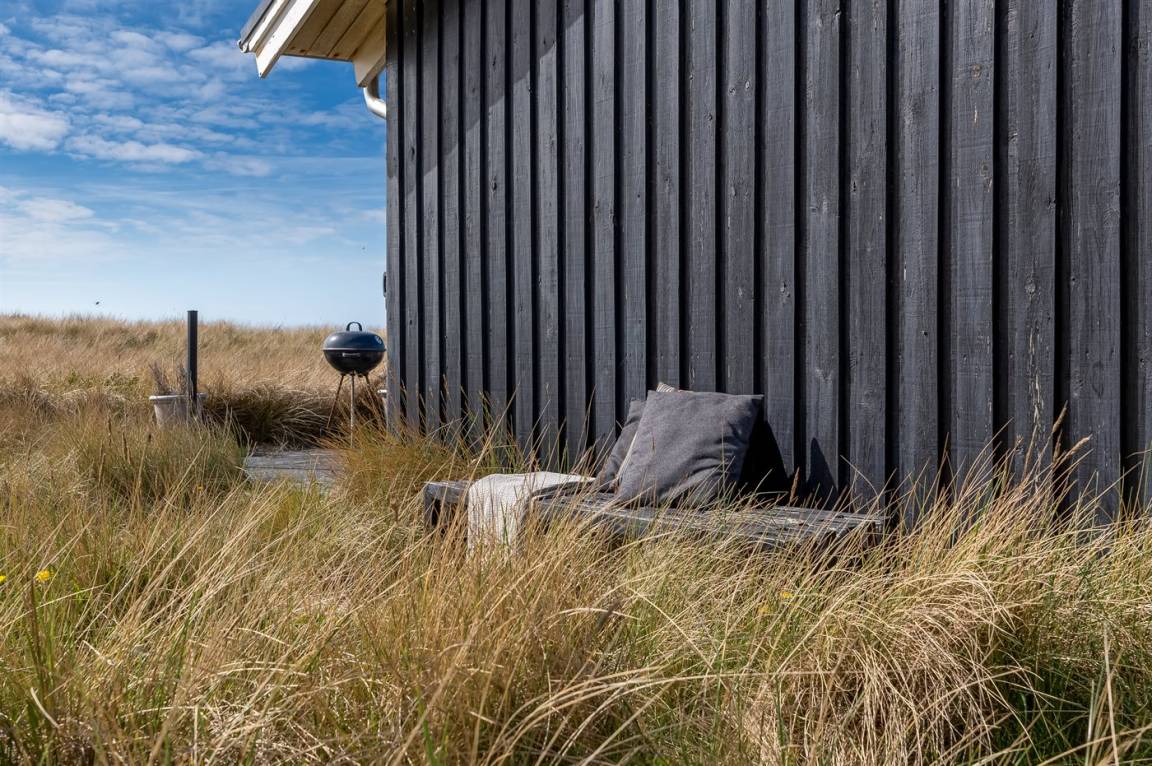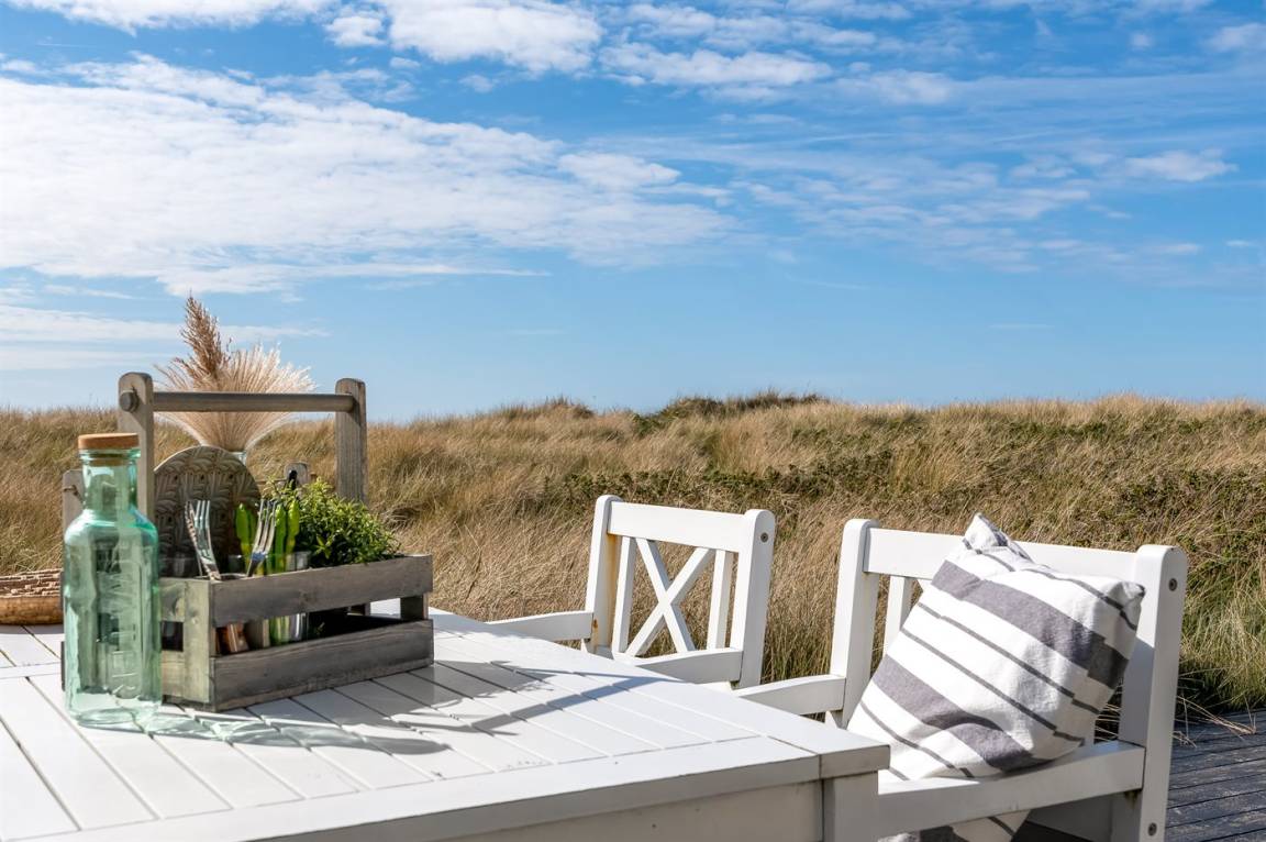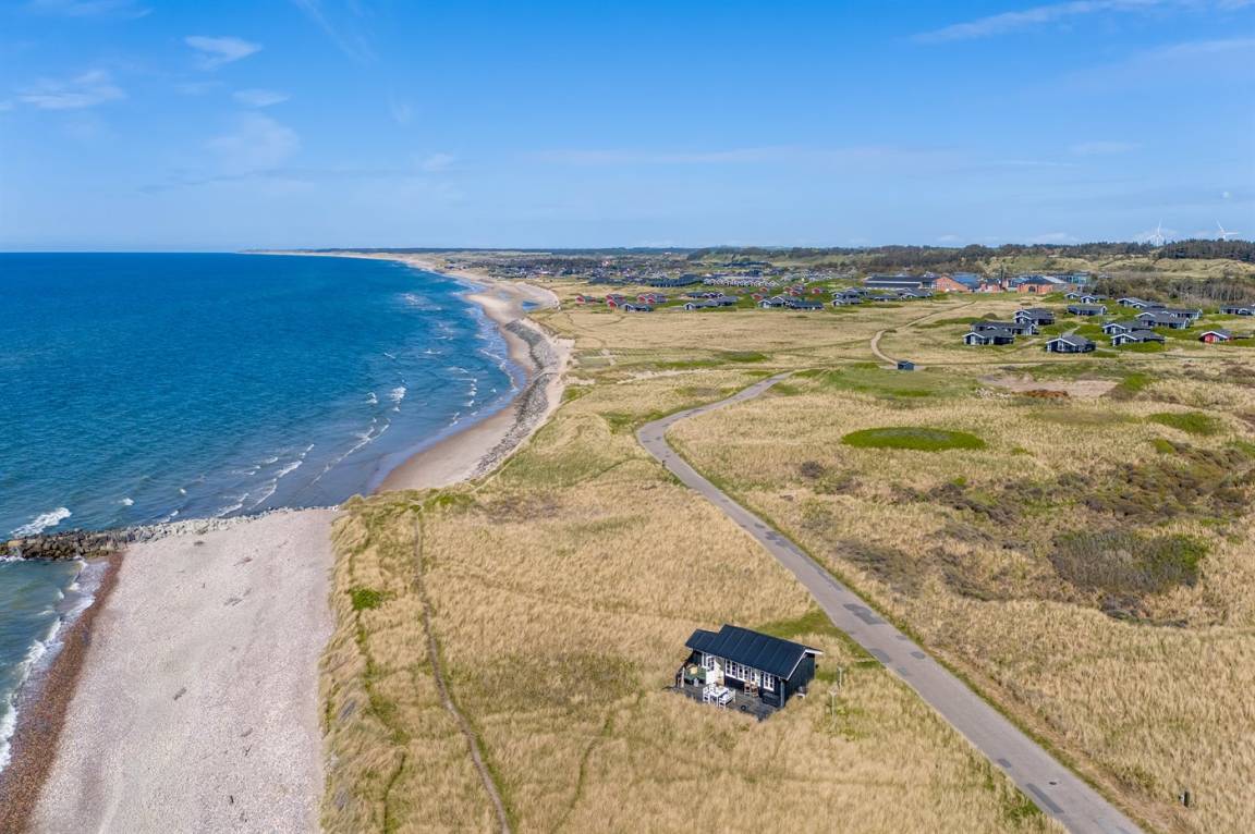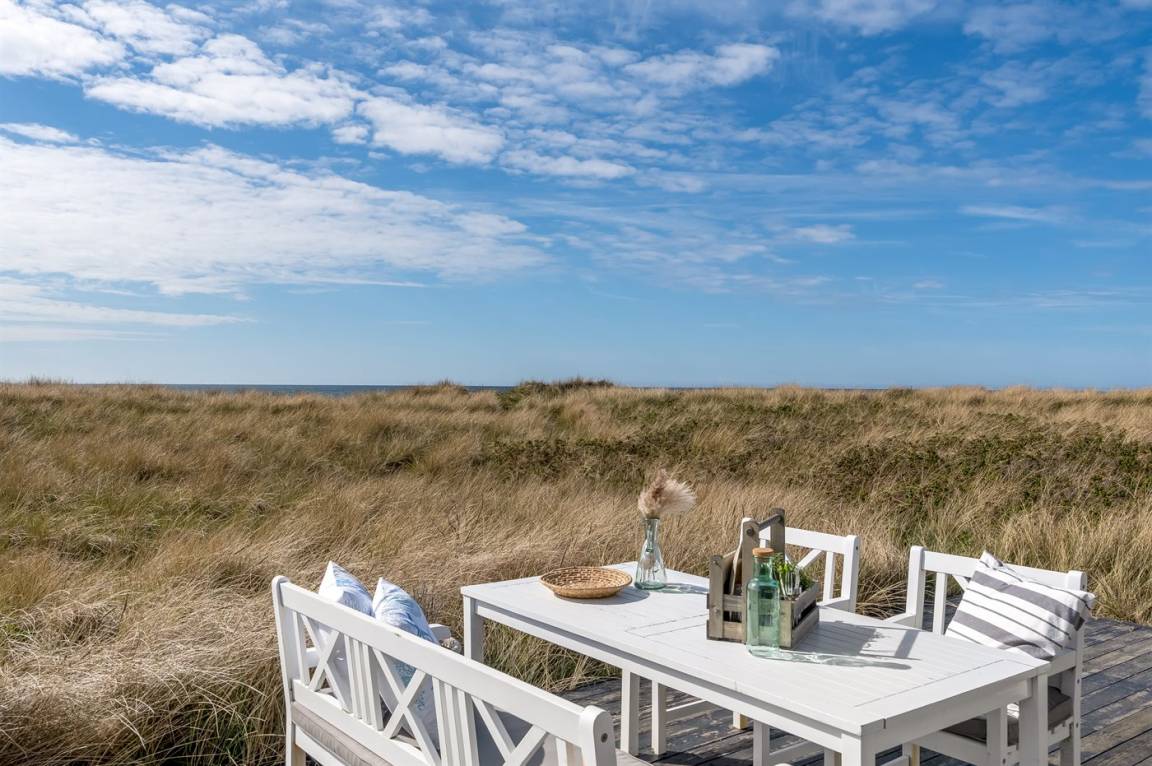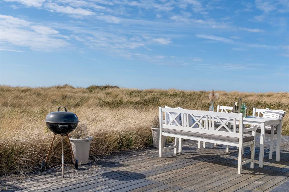 DraußenDie Ferienunterkunft liegt auf einem 3000 m² großen Dünengrundstück. Die Entfernung zum Meer beträgt 20 m. Die nächste Einkaufsmöglichkeit liegt 500 m entfernt. Es steht ein 30 m² Terrassenareal zur Verfügung. Parkplatz auf dem Grundstück.