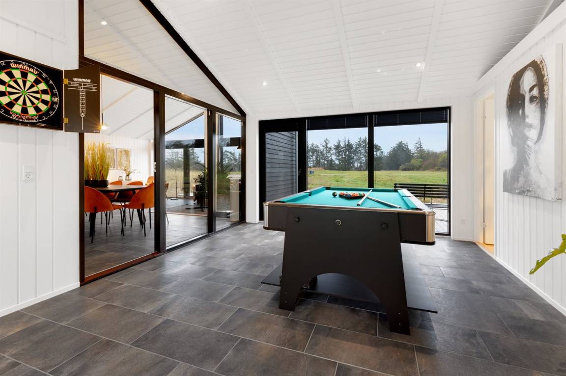 „Advice to other guests: Vi havde en fantastisk ferie med vores venner - i alt 8 personer. Det er et lækkert sommerhus, men den samlede oplevelse blev dog trukket ned på grund af for lidt køleskabsplads, et alt for billigt pool bord, hvor bundpladen buer og kuglerne derfor ruller ind mod midten og generelt billigt køkkeninventar - ex en brødrister til kun 2 skiver brød. The vacation at the holiday home: Vi måtte starte med at støvsuge under sofaer og senge. Der var kaffepletter og andet ned af køkkenlåger og der lå glasskår i opvaskemaskinen. Vi gjorde opmærksom på dette, men gjorde selv rent. Udstyret i køkkenet finder vi ikke optimalt i et helt nyt sommerhus. Feks. Var der en brødrister til 2 skiver brød og grillen var også meget lille og sommerhuset er jo til 10 personer. Departure and follow up: Vi mangler bare svar og opfølgning på de punkter vi har påpeget“