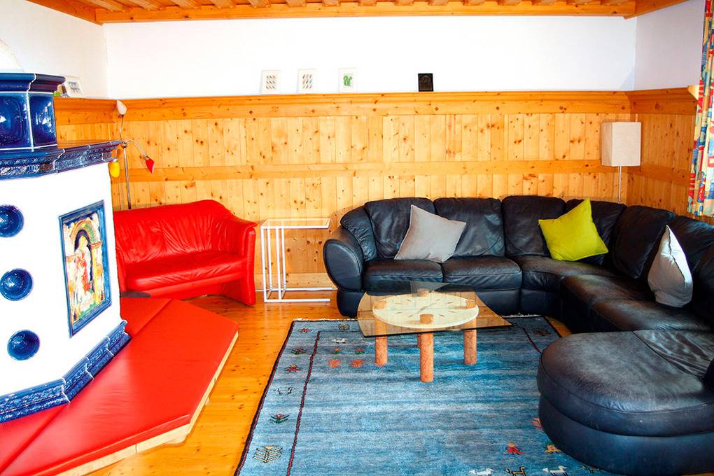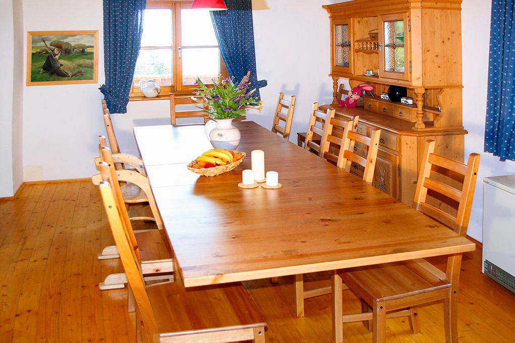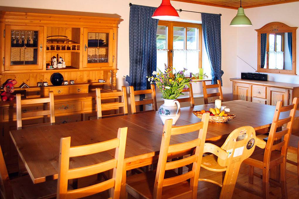 1. Etage: Gemütliches Wohnzimmer mit Kachelofen, Sofa-Sitzgruppe, Sat-TV, Stereoanlage, Balkon. Großes Esszimmer mit Esstisch (20 Pers.). Moderne Küche mit Küchenzeile (4 Pl. E-Herd, Backofen, Tiefkühltruhe, Spülmaschine). 2 separate WC.