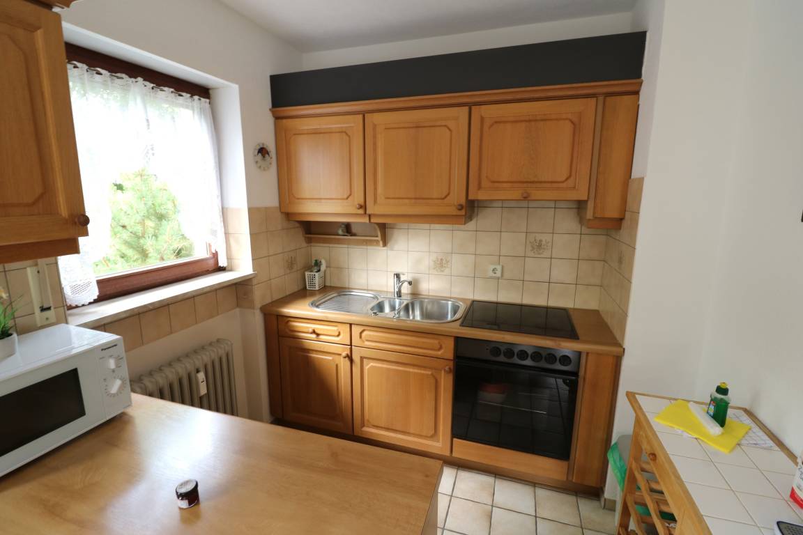 Die Küchenzeile im Wohnzimmer ist komplett mit Herd, Backofen, Kühlschrank, Senseo-Pad-Maschine und Filterkaffeemaschine, Wasserkocher, Toaster, Mikrowelle und Küchenutensilien ausgestattet. Auch der Essplatz mit 4 Stühlen befindet sich im Wohnzimmer. Wlan steht in der Wohnung zur Verfügung.