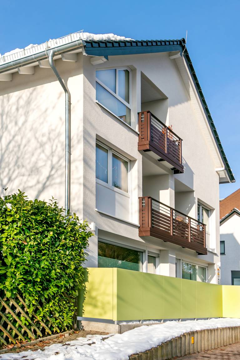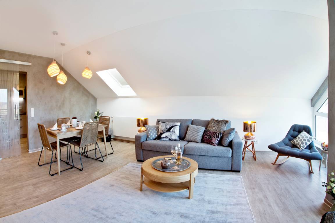 Lichtdurchflutet präsentieren sich Wohn- und Esszimmer mit üppiger Fensterfront unter dem Dach. Ein Sessel in der Lounge-Ecke lädt zum Entspannen ein - für den Kaffee am Morgen, das Glas Wein am Abend oder ein gutes Buch. Gegenüber des kuscheligen, hochwertigen Sofas befindet sich die Cine-Wall mit Flachbild-TV. Die Kissen stammen von Westwing, ein Materialmix mit Samt, Strick und Fell. Über dem großzügigen Holztisch von Studio Copenhagen spenden die Pendelleuchten von Graypants sanftes Licht. Auf dem West-Balkon, mit Blick zum Wald, bieten sich Sitzmöglichkeiten für zwei bis drei Personen.
