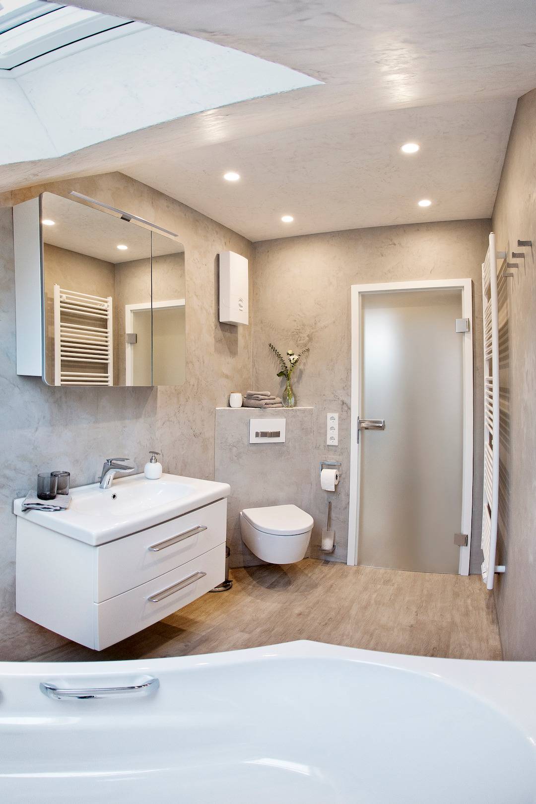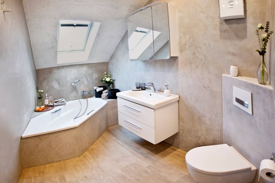 Im neuen Bad befindet sich eine komfortable Dusch-Badewanne, ein Waschbecken und WC. Außerdem: ein großer Spiegelschrank, ein Kosmetik-Spiegel, Föhn, Handtücher und Vorleger. Das Bad kann mit Tageslichtfenster gut belüftet werden und ist lichtdurchflutet und einladend.
