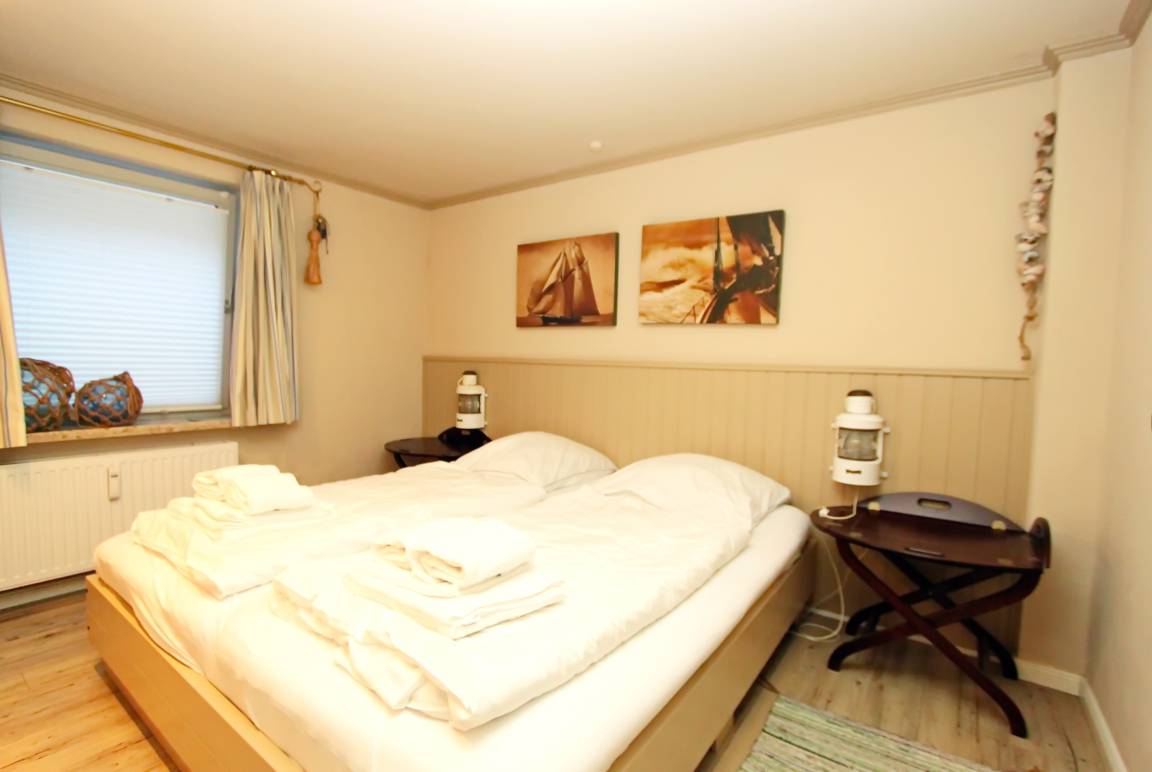 Die voll ausgestattete Küche verfügt über ein vier Platten Cerankochfeld, Geschirrspüler, Mikrowelle, Kühlschrank sowie alle Utensilien, die benötigt werden, um sich selbst zu versorgen. Vom Flur mit Garderobe geht ein Schlafzimmer ab. Dort stehen zwei Einzelbetten mit kleinen Nachttischen und ein großer Einbaukleiderschrank, der ausreichend Stauraum bietet. Vom Wohnzimmer gelangen Sie über eine Treppe ins Untergeschoss. Dort befindet sich neben dem Duschbad/WC der zweite Schlafraum. Dieser verfügt über ein Doppelbett, Nachttische und ein Fenster. Durch den Lichtschacht kommt Tageslicht hinein. Im Flur sind ebenfalls Einbauschränke.