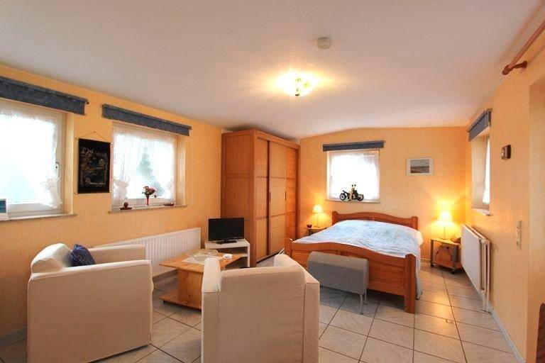 sowie einem separaten Duschbad. Direkter Zugang vom großen Garten. Die Größe beträgt ca. 25 qm. Wohn-Schlafraum mit gefliestem Boden.