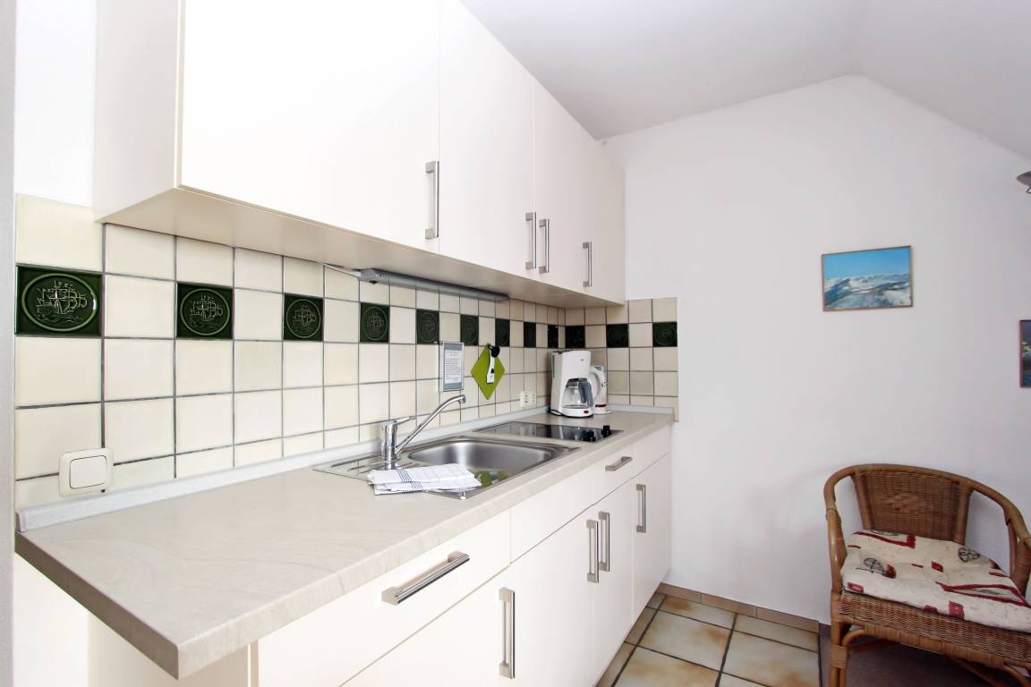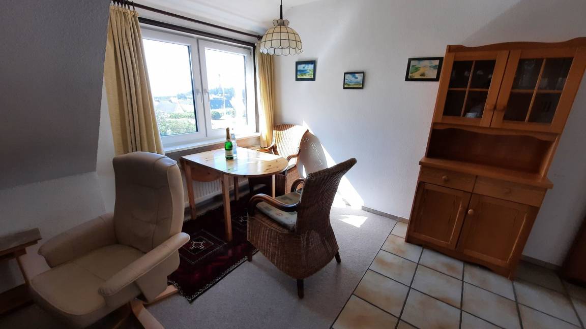 Diese kleine Ferienwohnung für zwei Personen im Haus Meerblick hat zwei getrennte Zimmer, davon ein Schlafzimmer mit Boxspringbett, und ein Wohnzimmer mit Küchenzeile.