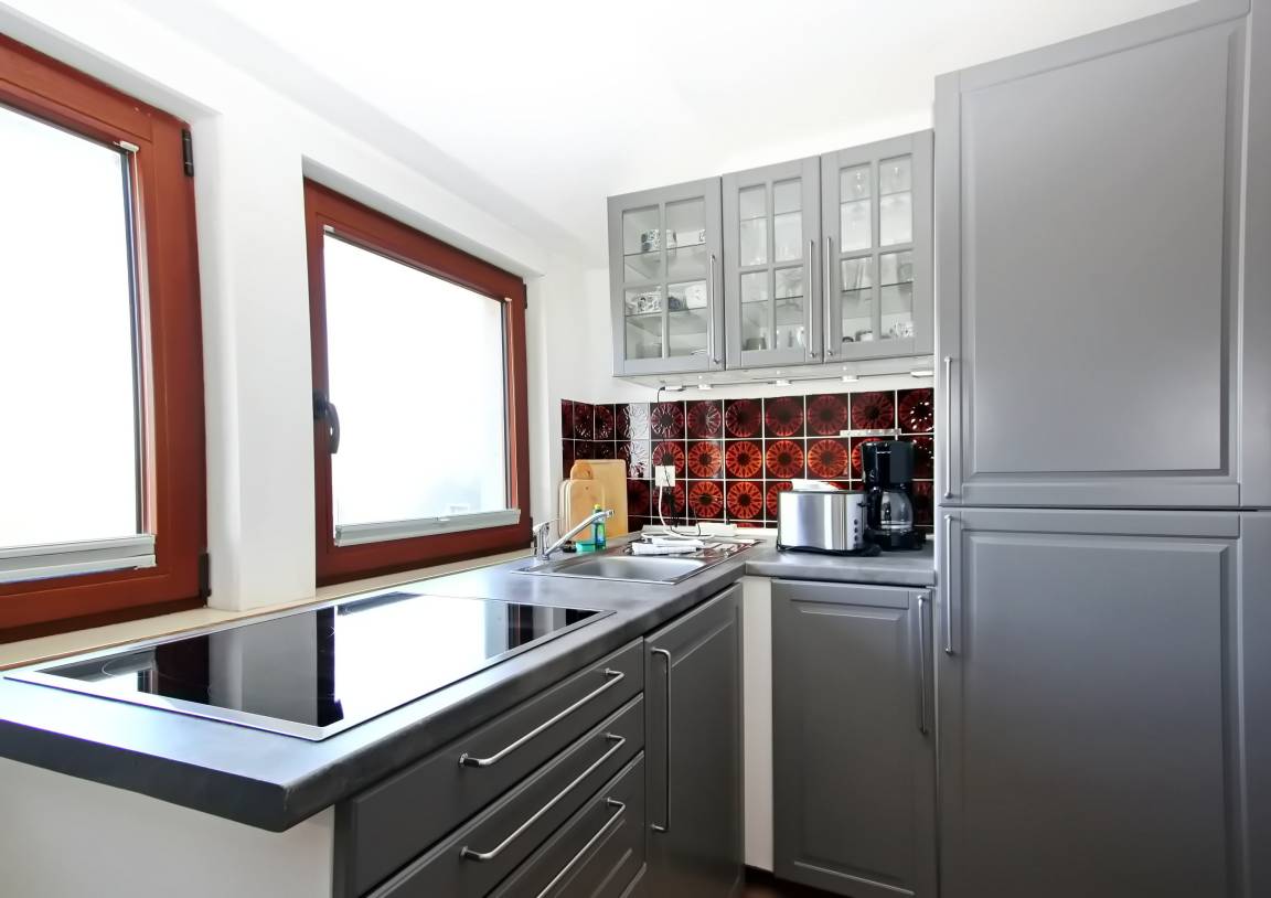 Ein neuer offener Küchenbereich mit Cerankochfeld, Kühlschrank und allen Utensilien, die Sie benötigen, um sich selbst zu verpflegen.