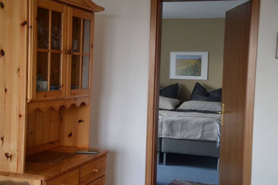 Diese kleine Ferienwohnung für zwei Personen im Haus Meerblick hat zwei getrennte Zimmer, davon ein Schlafzimmer mit Boxspringbett, und ein Wohnzimmer mit Küchenzeile.