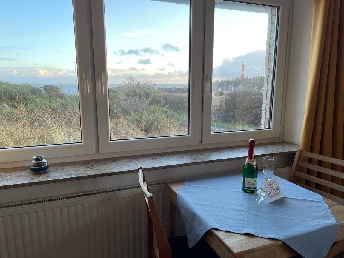 Das Haus liegt auf einer Düne am Ende einer Sackgasse direkt über dem Hafen, eine lange Treppe führt hinunter zum Hafen und den Ausflugsschiffen. Vom Essplatz aus hat man einen fantastischen Blick auf das Meer, auf die Nachbarinseln Amrum und Föhr sowie auf die Südspitze mit Leuchtturm. Bei klarer Sicht kann man sogar die Halligen Langeneß und Hooge sehen.