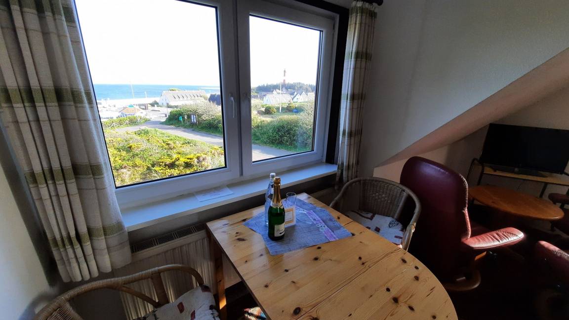 Das Haus liegt auf einer Düne am Ende einer Sackgasse direkt über dem Hafen, eine lange Treppe führt hinunter zum Hafen und den Ausflugsschiffen. Vom Essplatz aus hat man einen fantastischen Blick auf das Meer, auf die Nachbarinseln Amrum und Föhr sowie auf die Südspitze mit Leuchtturm. Bei klarer Sicht kann man sogar die Halligen Langeneß und Hooge sehen.