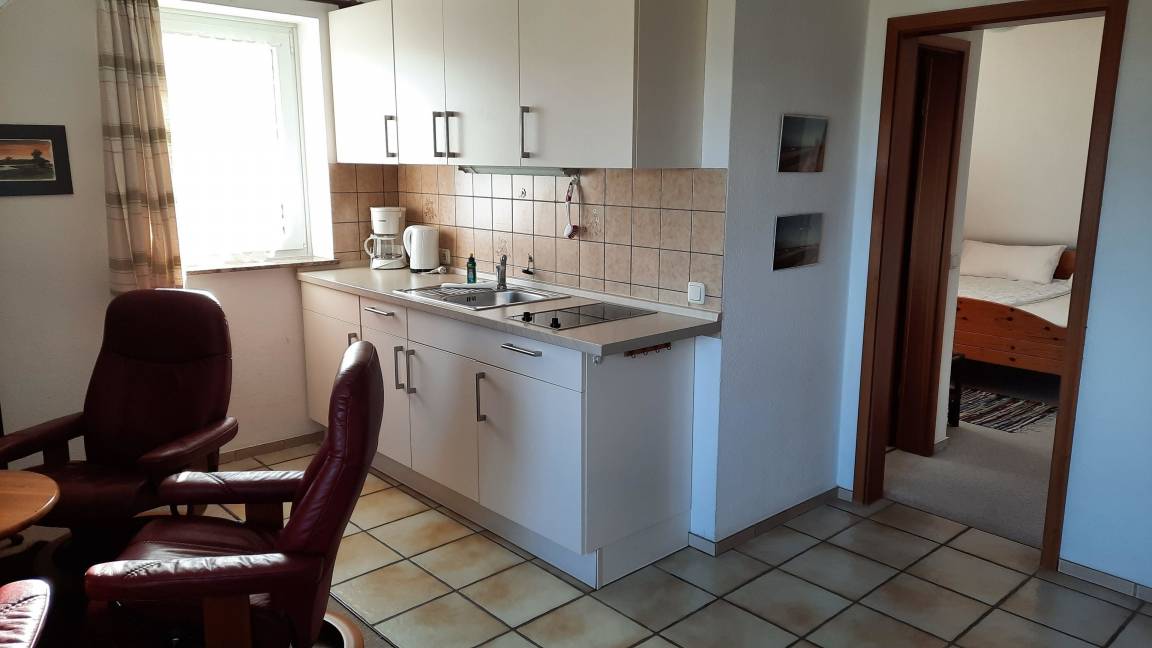 Diese kleine Ferienwohnung für zwei Personen im Haus Meerblick hat zwei getrennte Zimmer, davon ein Schlafzimmer mit Boxspringbett, und ein Wohnzimmer mit Küchenzeile.