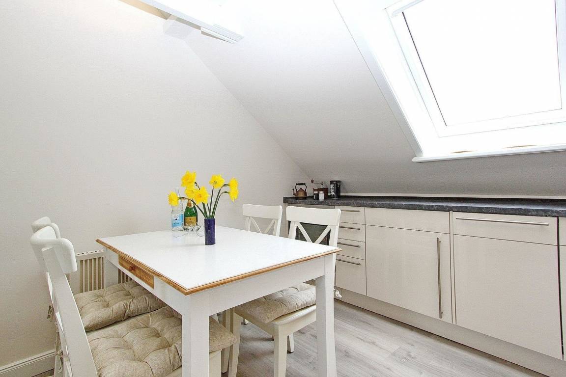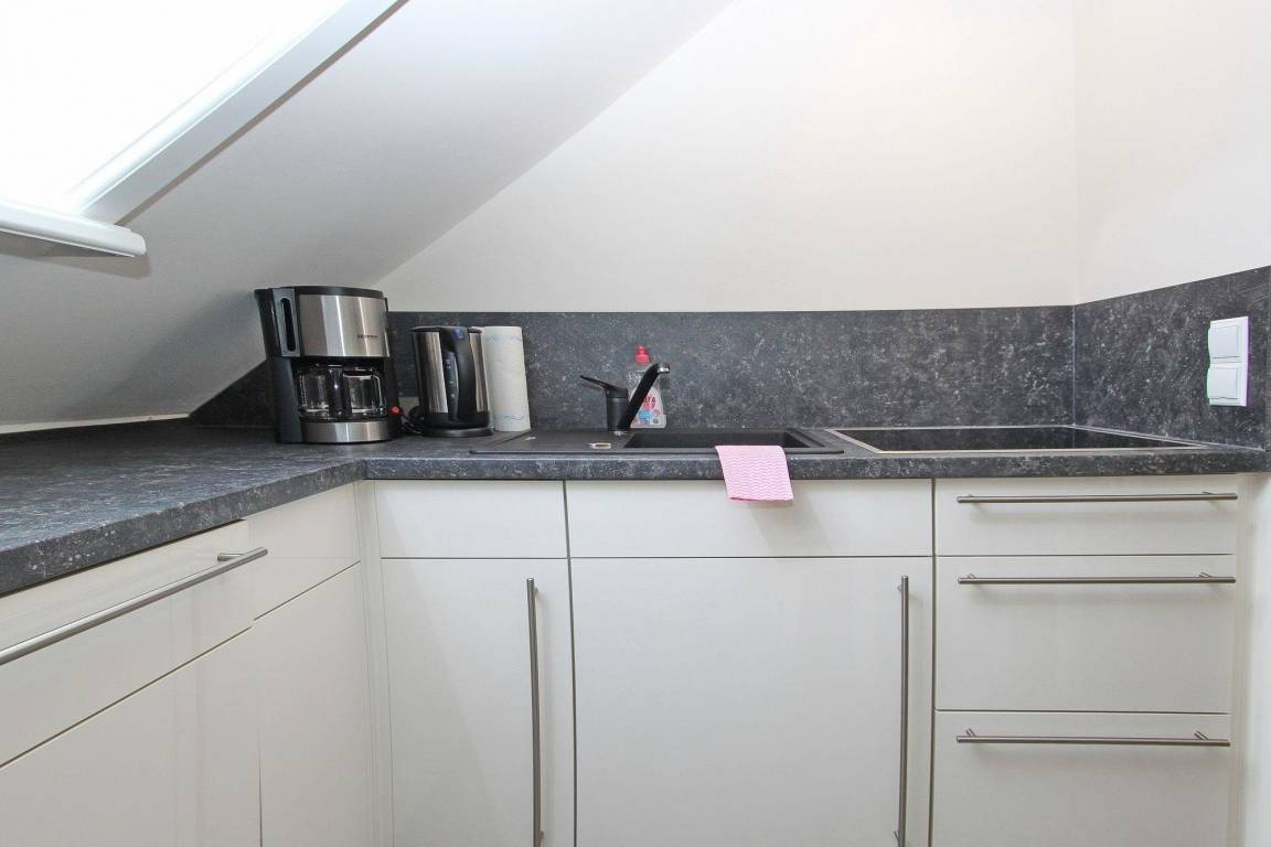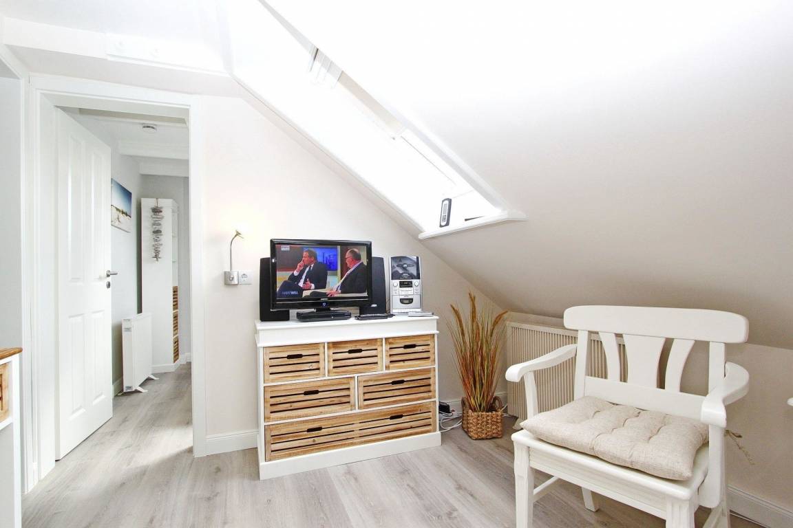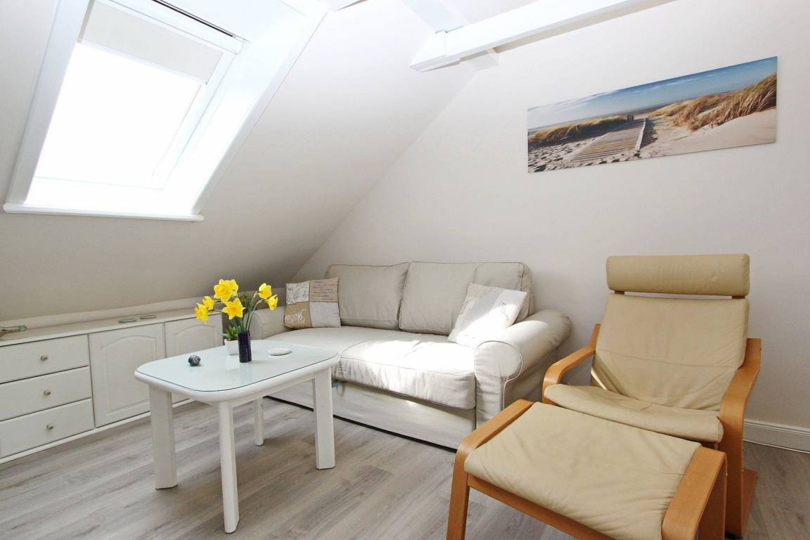 In 2016 kernsaniertes 2 Zimmer DG Appartement im Ortskern von Hörnum mit ca. 35m² für bis 3-4 Personen; ein Wohnraum mit einer neuen Schlafcouch, Tisch, Relax-Sessel zum Entspannen, Esstisch mit 4 Stühlen, offene Einbauküche mit Cerankochfeld, Backofen, Kühlschrank mit Gefrierfach und Geschirrspüler, Sat-Flat-TV, Sideboard, Kommode, separater Schlafraum mit Doppelbett und Kleiderschrank; Flur mit Garderobe und Bank, Duschbad/WC. Das Rauchen ist nicht gestattet! Ein PKW-Stellplatz (Nr. 9) gehört zum Appartement. Im Keller befindet sich eine Waschküche mit Münzwaschmaschine und Münztrockner. WLAN und Festnetzanschluss kostenlos vorhanden. Für die Internetnutzung ist eine Nutzungsvereinbarung zu unterschreiben.