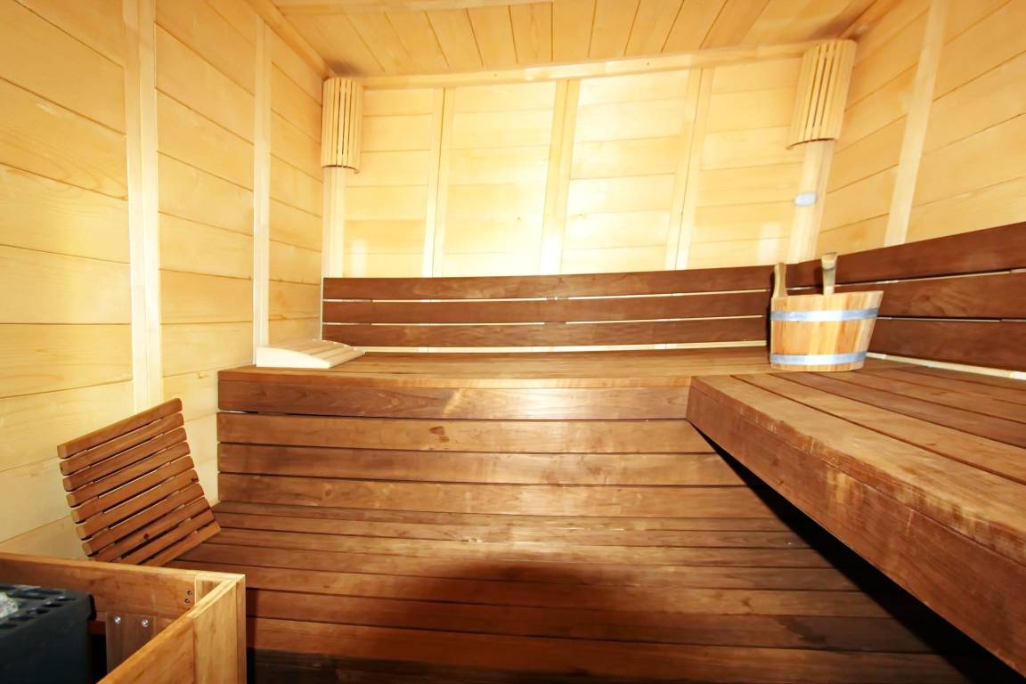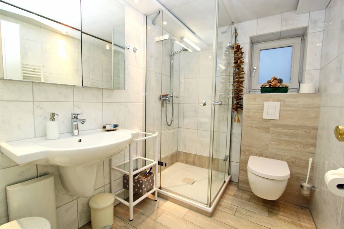 Die voll ausgestattete Küche verfügt über ein vier Platten Cerankochfeld, Geschirrspüler, Mikrowelle, Kühlschrank sowie alle Utensilien, die benötigt werden, um sich selbst zu versorgen. Vom Flur mit Garderobe geht ein Schlafzimmer ab. Dort stehen zwei Einzelbetten mit kleinen Nachttischen und ein großer Einbaukleiderschrank, der ausreichend Stauraum bietet. Vom Wohnzimmer gelangen Sie über eine Treppe ins Untergeschoss. Dort befindet sich neben dem Duschbad/WC der zweite Schlafraum. Dieser verfügt über ein Doppelbett, Nachttische und ein Fenster. Durch den Lichtschacht kommt Tageslicht hinein. Im Flur sind ebenfalls Einbauschränke. Vom vorderen Hauseingang kommen Sie in den Wellnessbereich mit einem Schwimmbad und Sauna (gegen Gebühr).