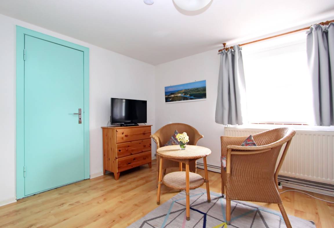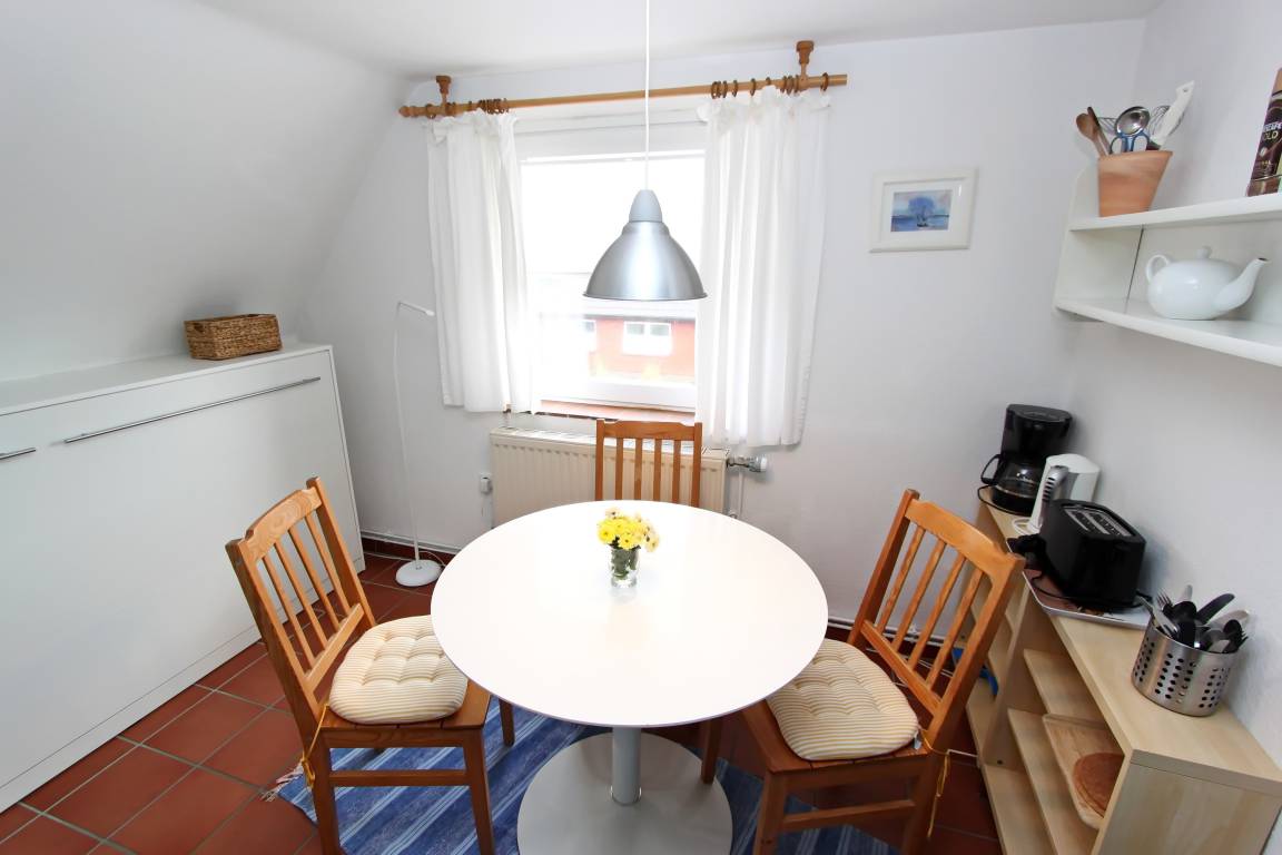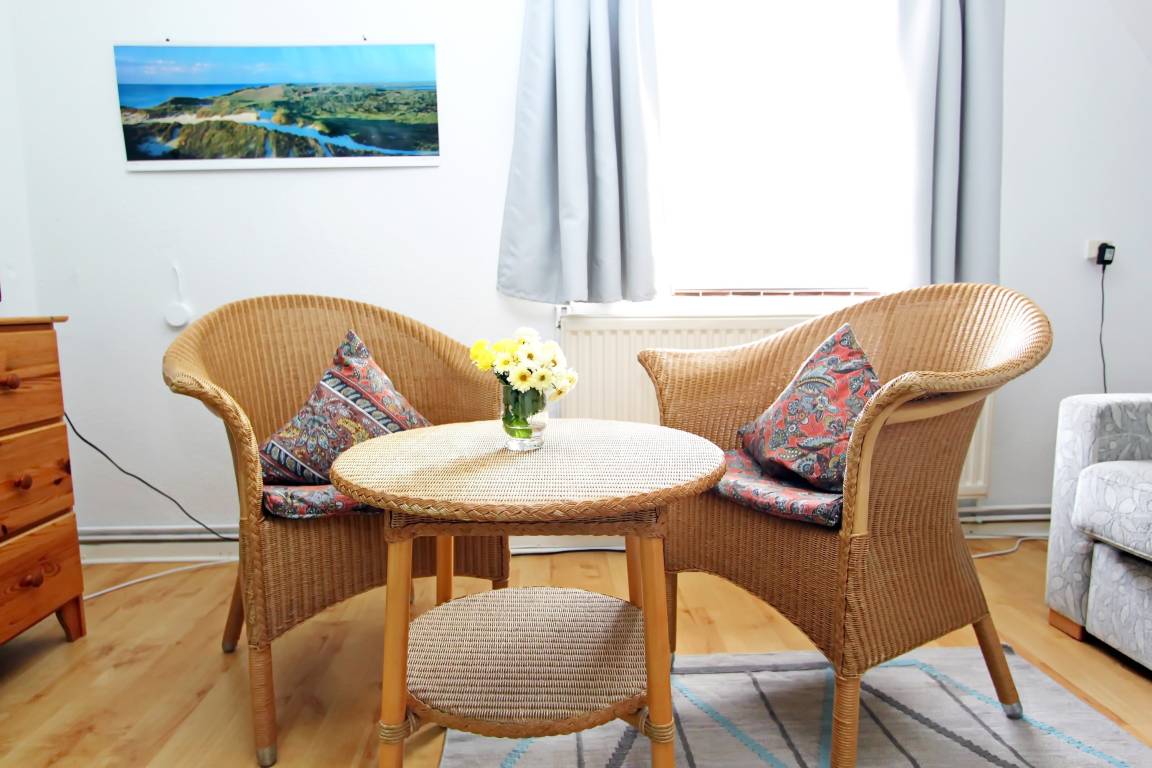 Die Wohnung Nr. 2 (für eine bis drei Personen) im Obergeschoß des Hauses ATLANTIS heißt Wohnung Dünenblick. Sie hat zwei Räume mit drei Schlafplätzen und ist freundlich und gemütlich. Sie ist ausgestattet mit einer Kochnische und einem kleinen Duschbad. Der Blick aus den Fenstern geht nach Osten auf die Dünenkette auf der Wattseite der Insel. Die Wohnfläche beträgt ca 27 qm.