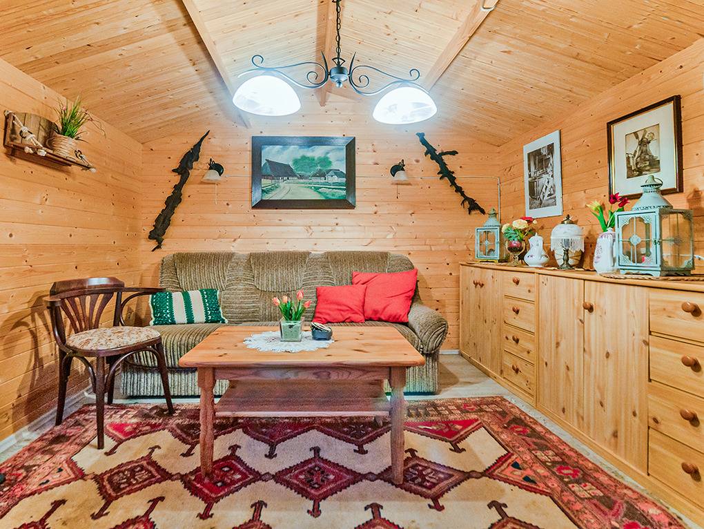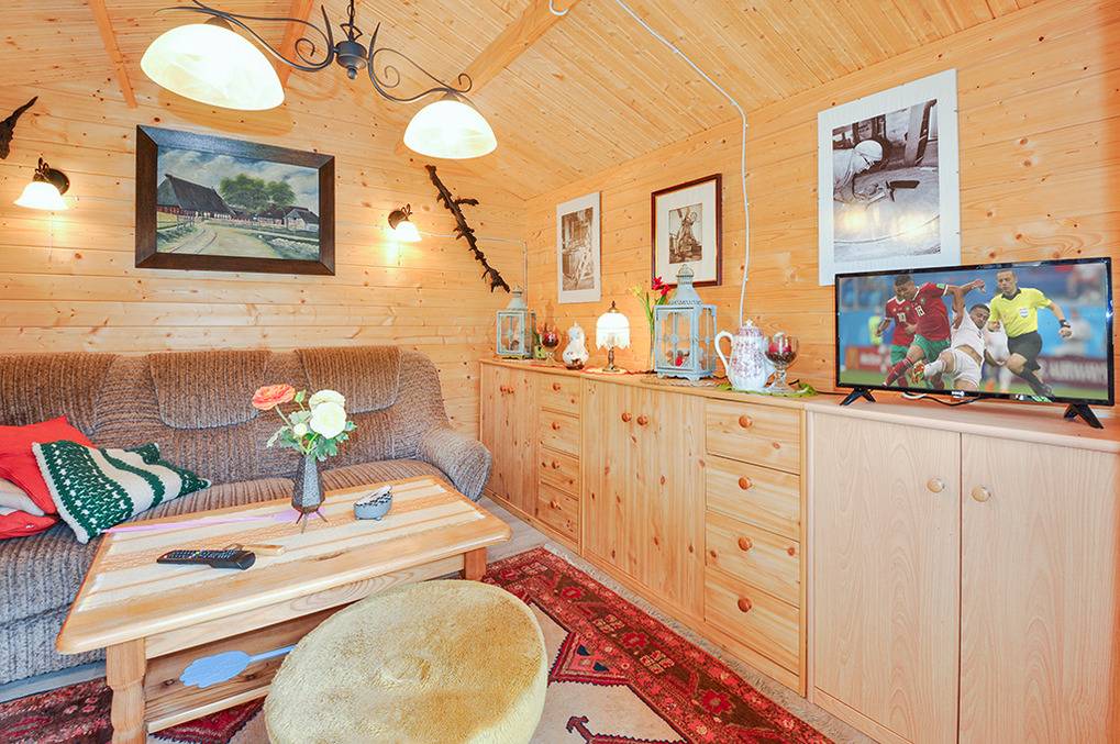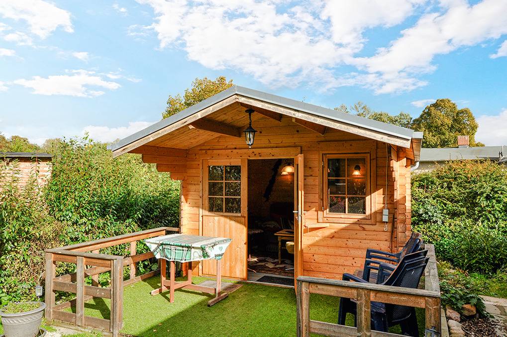 D 45.31 Ferienhaus 1-3 Pers.: 2-Zimmerwohnung mit 30 qm Wohnfläche. Parterre: Eingang, kleiner Flur, Garderobe. Steile Treppe in die 1. Etage (Dachschrägen): Gemütlicher Wohn-/Essraum mit Kaminofen, Couchgarnitur (Schlafsofa 1 Pers.), Sat-TV, kleiner Pantry-Küche (2 E-Platten, Mikrowelle). 3-Bettzimmer mit Doppelbett, Schlafcouch. Kleines, einfaches Bad: Du, Wb, WC. Im Garten: Gartenhaus mit gemütlicher Sitzecke, Sat-TV, Terrasse (Gartenmöbel).