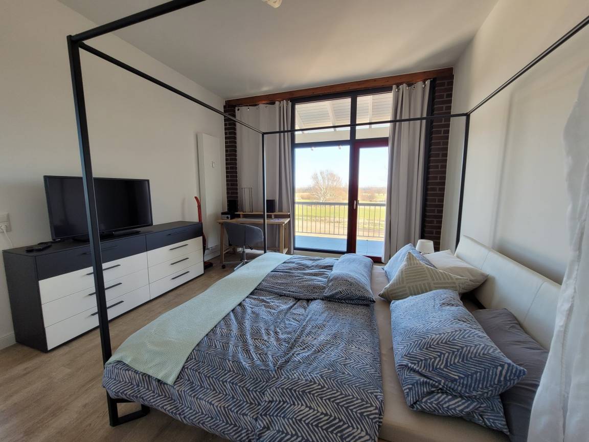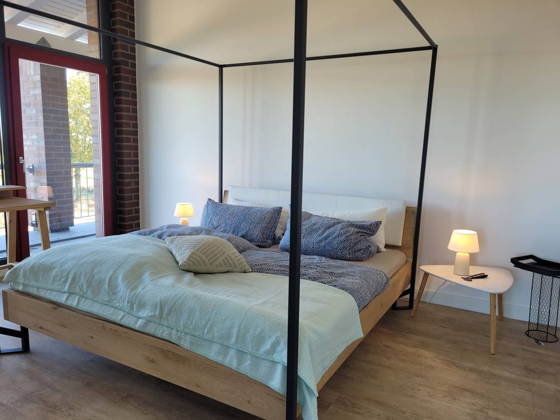 Im gemütlichen Schlafzimmer mit großem Himmelbett (1,80m x 2,10m), einer geräumigen Kommode sowie Bank und Kofferständern verbringen Sie in unfassbarer Ruhe erholsame Nächte. Ein modernes Bad mit Dusche, Waschbecken, Handtuchheizung und WC rundet das Angebot ab. Gemeinschaftlich können Waschmaschine und Wäschetrockner gegen Gebühr genutzt werden.