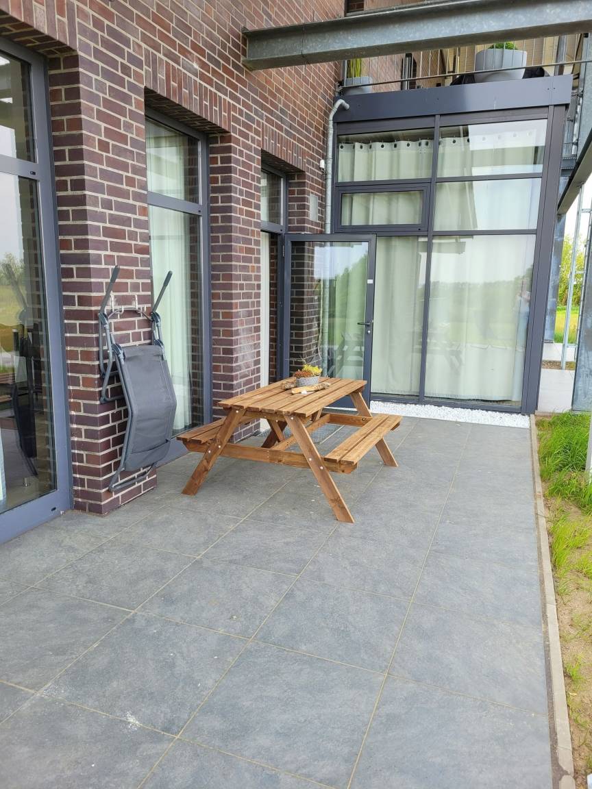 Die Wohnung ist modern nach gehobenem Standard ausgestattet und verfügt sowohl über Terrasse als auch Balkon, beide mit traumhaftem Blick auf die etwa 15 Gehminuten entfernte Ostsee und den direkt angrenzenden 18-Loch-Golfplatz. Ob Golfspieler oder Typ Badestrand oder doch eher Typ Naturstrand zum Wandern und Bernsteinsammeln – es ist alles in fußläufiger Nähe vorhanden. Und wer dann doch „Langeweile" aufgrund traumhafter Ruhe verspürt, für den bieten das Ostseebad Boltenhagen und die wunderschöne Hansestadt Wismar – jeweils knapp 20 Autominuten entfernt – genügend Trubel und weitere Aktivitäten.