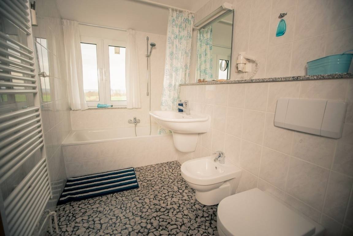 - Badezimmer mit Badewanne, Waschbecken, WC, Spiegel, Bidet