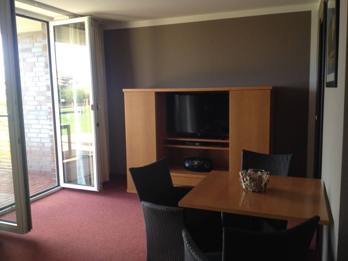 Im Wohnzimmer (Tür abschließbar) dürft ihr euch auf ein großes Faltbettsofa (160 x 200cm) mit Lattenrost und Matratze, auf einen 40" LED TV mit Blue-Ray Player, Radio mit CD-Player, Plissee-Rollos an den bodentiefen Fenstern, einen Esstisch mit vier bequemen Stühlen, Leselampe und auf eine große Spielesammlung für drinnen und draußen freuen!